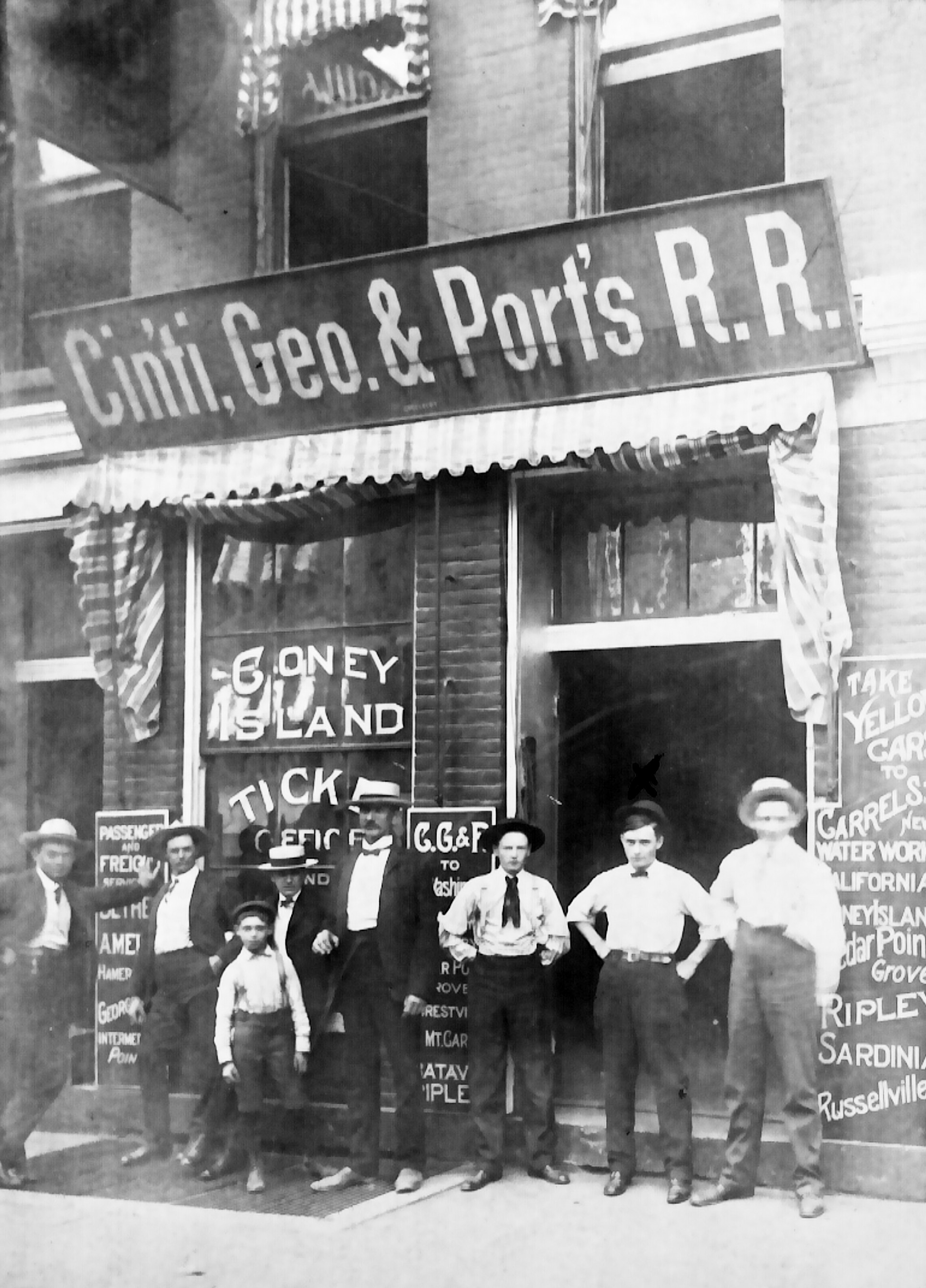 CG&P downtown station at 5th and Sycamore. The three men in the doorway are, from left to right: Charles Stephens, express messenger, Robert E. Havemann, agent, and Pat Coffey, assistant. The folks at the left are passengers waiting for the next car. From the collection of Robert E. Havemann, an agent of the CG&P, provided by his granddaughter Vicki Rafferty.