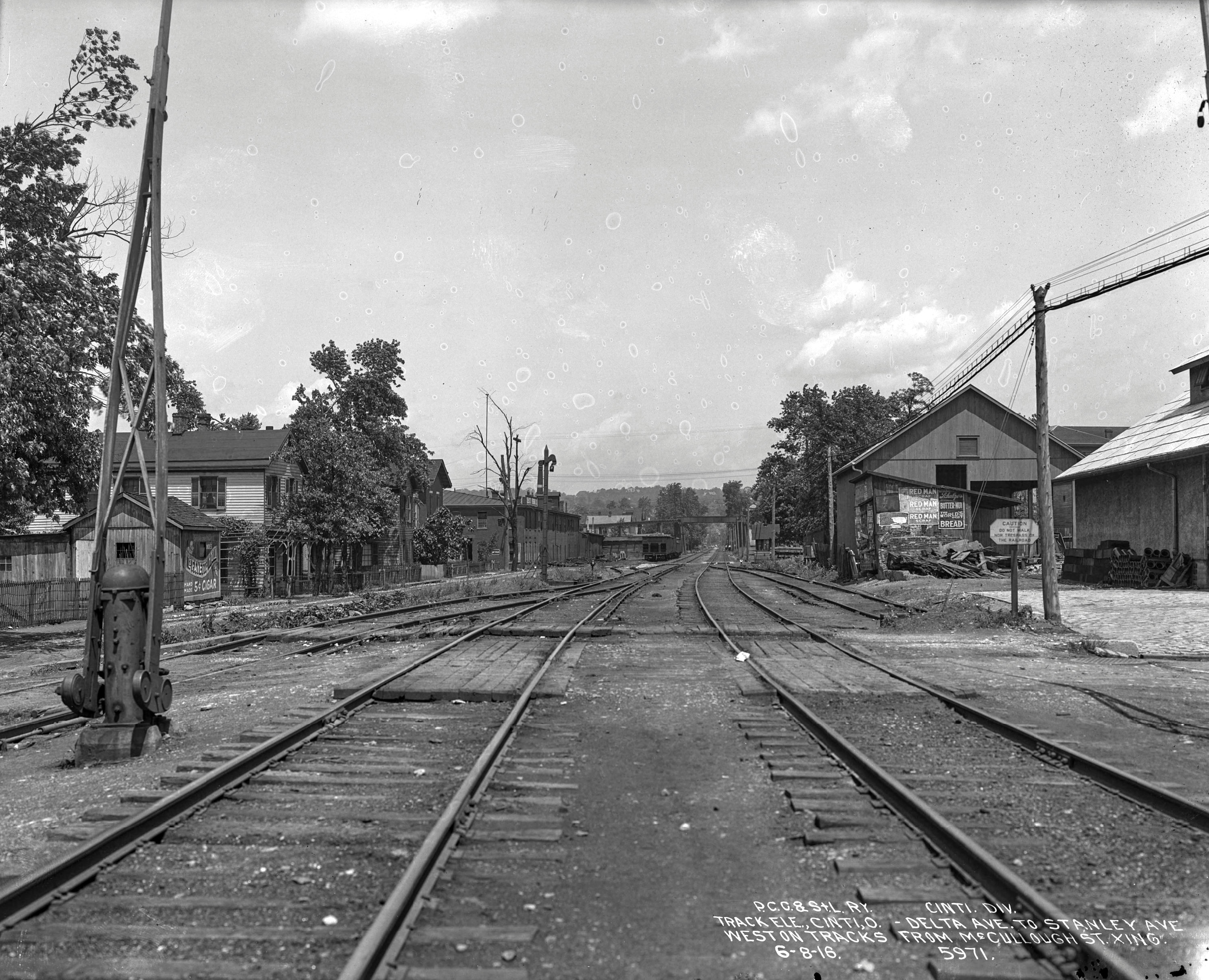 Historic photo of the Pennsylvania/Little Miami Railroad and CG&P connection at McCullough Street in Columbia-Tusculum, looking northwest. The CG&P track is the one to the left, and the Donham Avenue viaduct is visible in the distance. This photo was taken in preparation for the construction of overpasses at Delta and Stanley, which would eliminate the need for the Donham Avenue Viaduct.