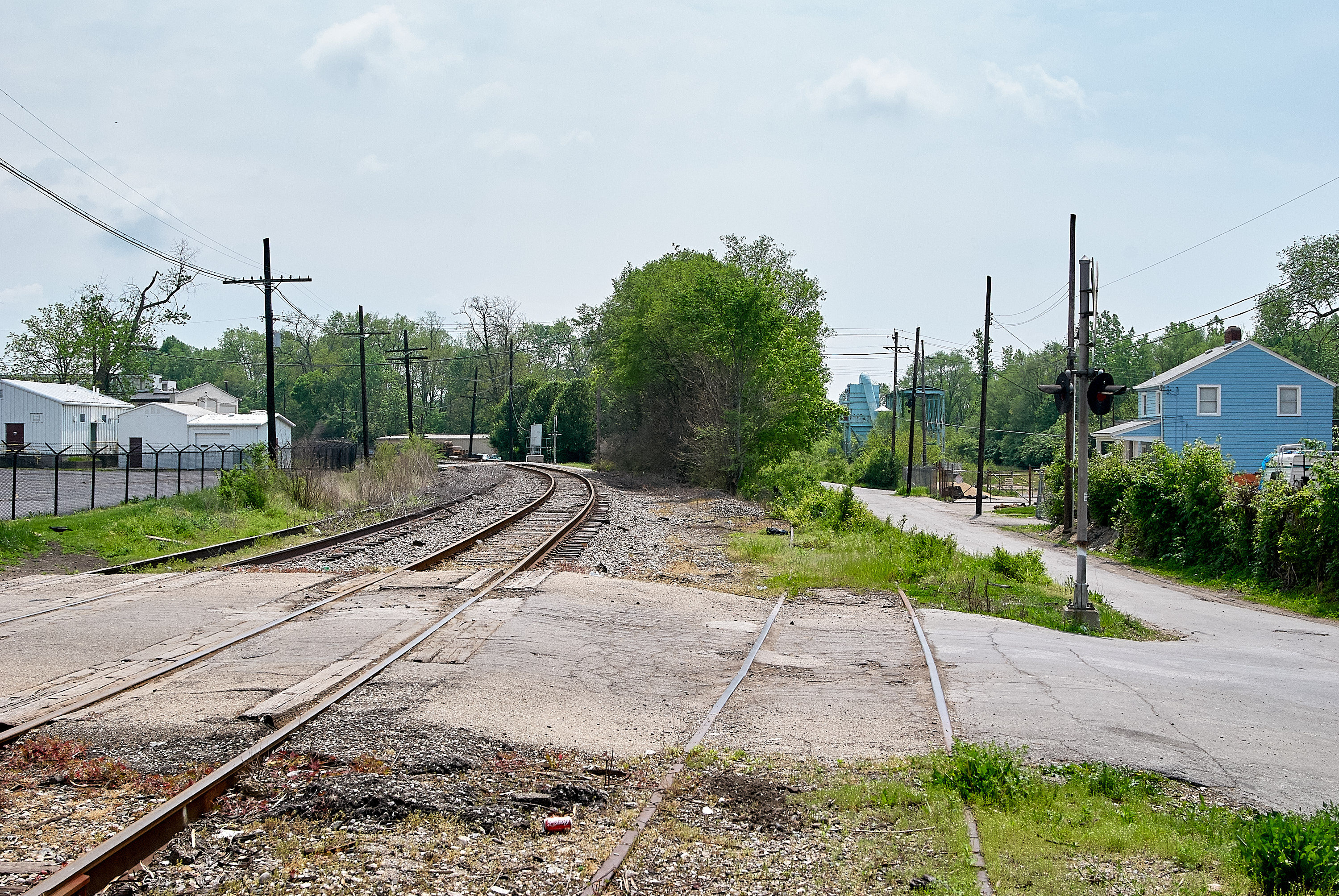 Connection of the CG&P and the Indiana & Ohio Oasis, former Pennsylvania/Little Miami Railroad at McCullough Street in Columbia-Tusculum, looking southeast with Dumont Street on the right. The two track mainline is curving slightly to the left, although the leftmost track is now abandoned. The spur in the foreground was once the CG&P. The PRR/Little Miami had a station in the small triangular piece of land in the center of the photo, where the thick trees are.