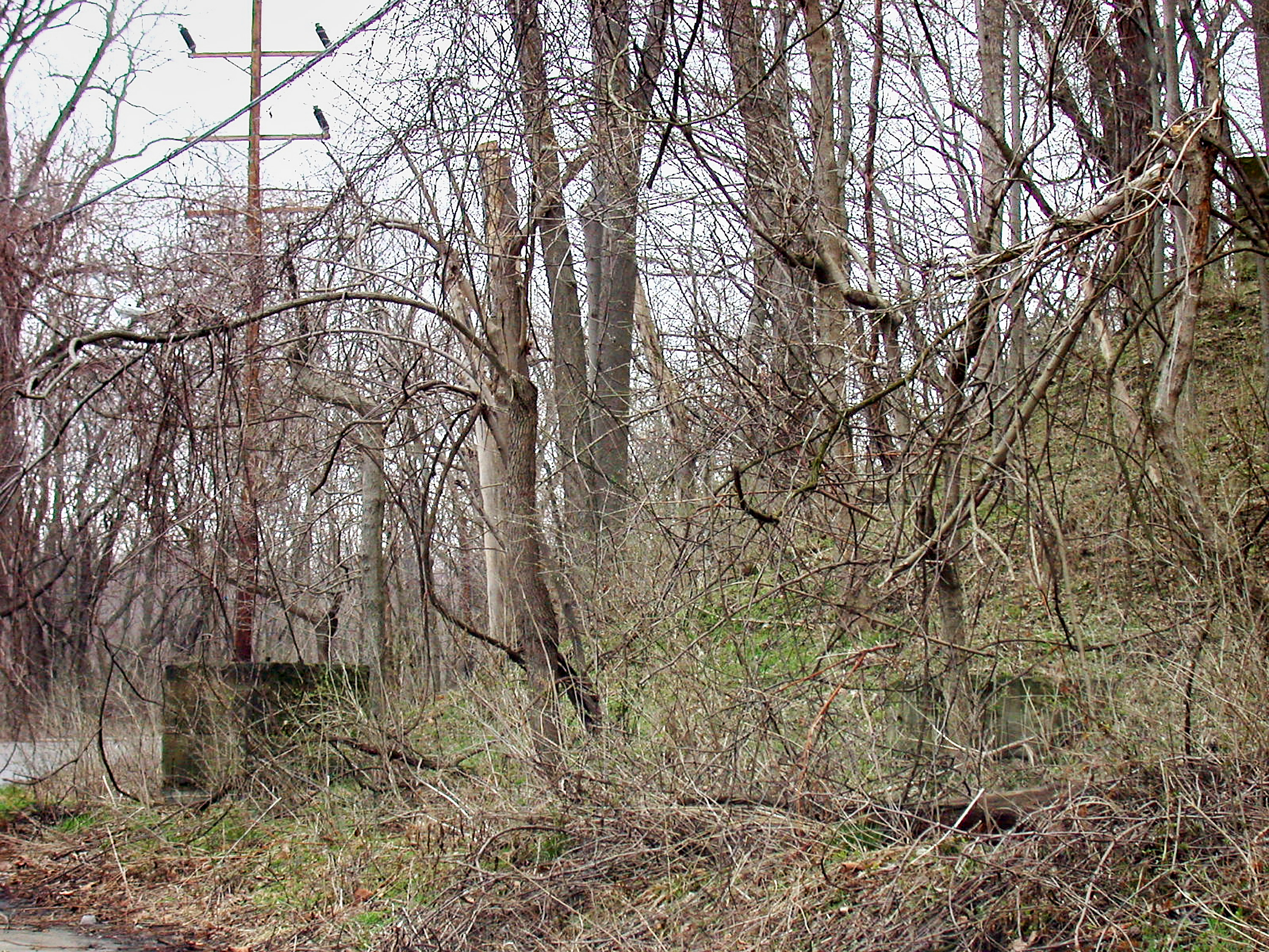 CG&P Lick Run trestle piers below California Junction, looking west along Kellogg Avenue in California Woods Preserve.