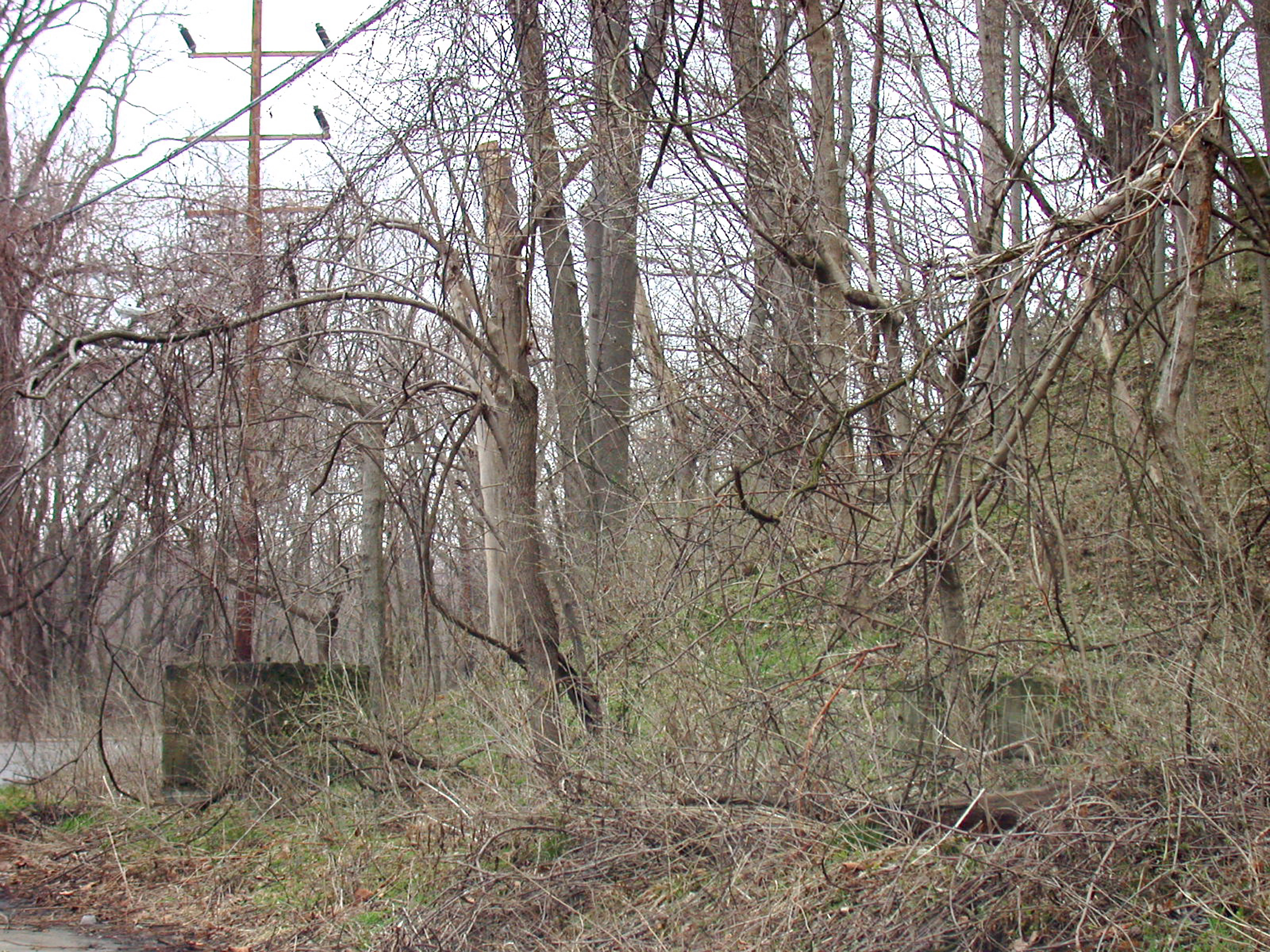 CG&P Lick Run trestle piers below California Junction, looking west along Kellogg Avenue in California Woods Preserve.