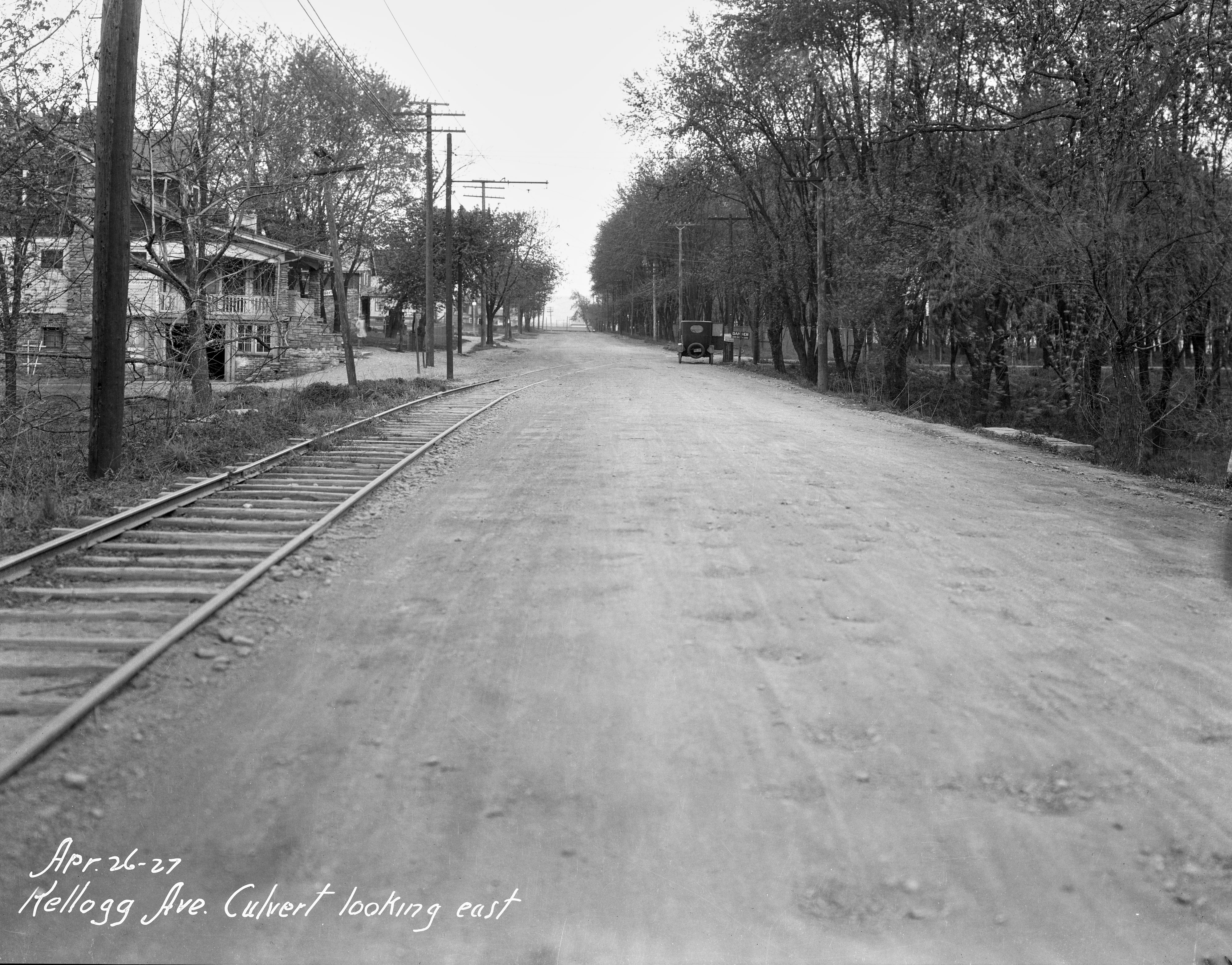 Historic photo of CG&P tracks from 1925 on Kellogg Avenue at Two Mile near Coney Island, looking southeast towards Two Mile just three months before abandonment of the California branch east of the waterworks. Lake Como and Coney Island are behind the trees on the right in the distance. From the University of Cincinnati Library Digital Resource Commons, Street Construction and Improvements collection.