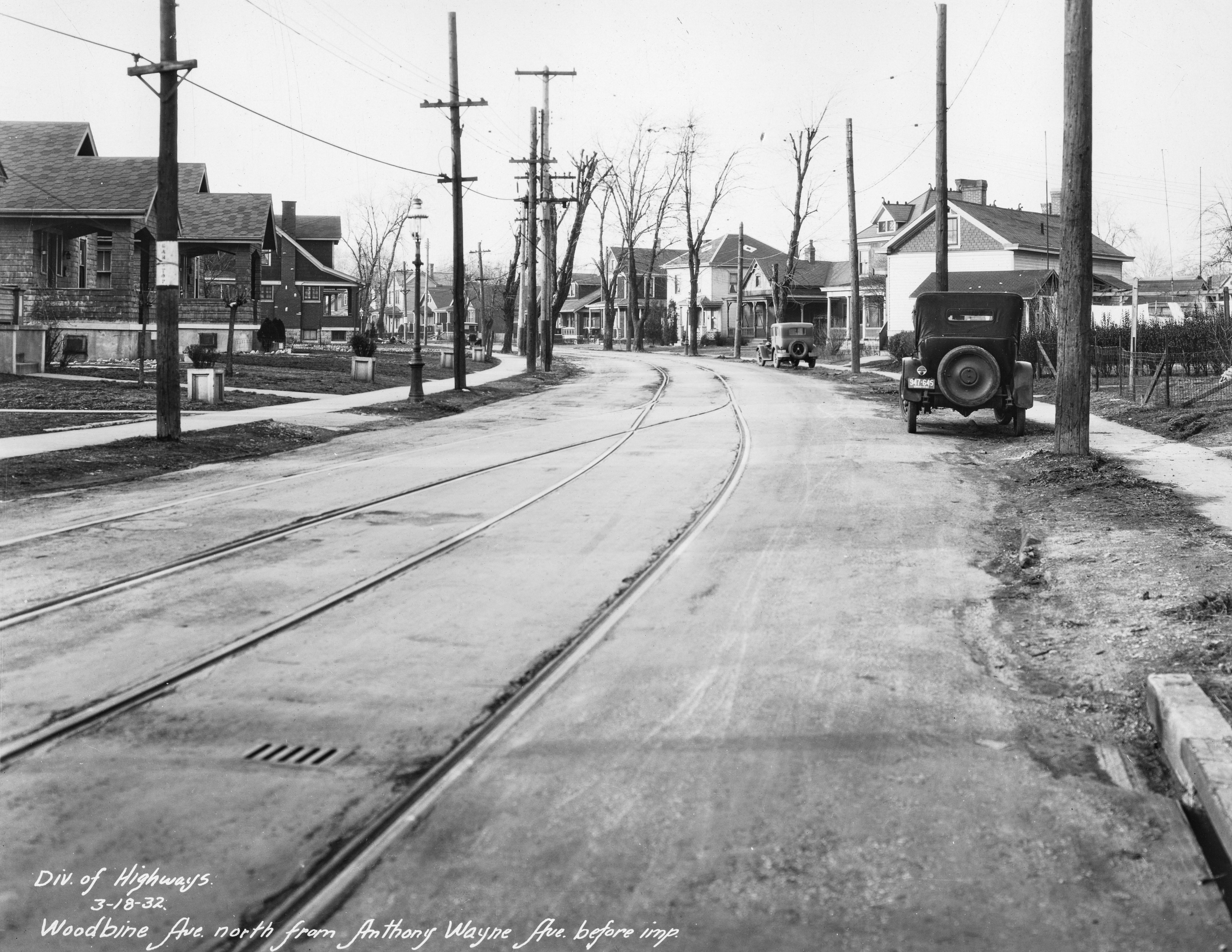 Historic photo of Cincinnati & Hamilton interurban tracks on Woodbine Avenue in Hartwell, looking north from Anthony Wayne Avenue. From the University of Cincinnati Library Digital Resource Commons, Street Construction and Improvements collection.