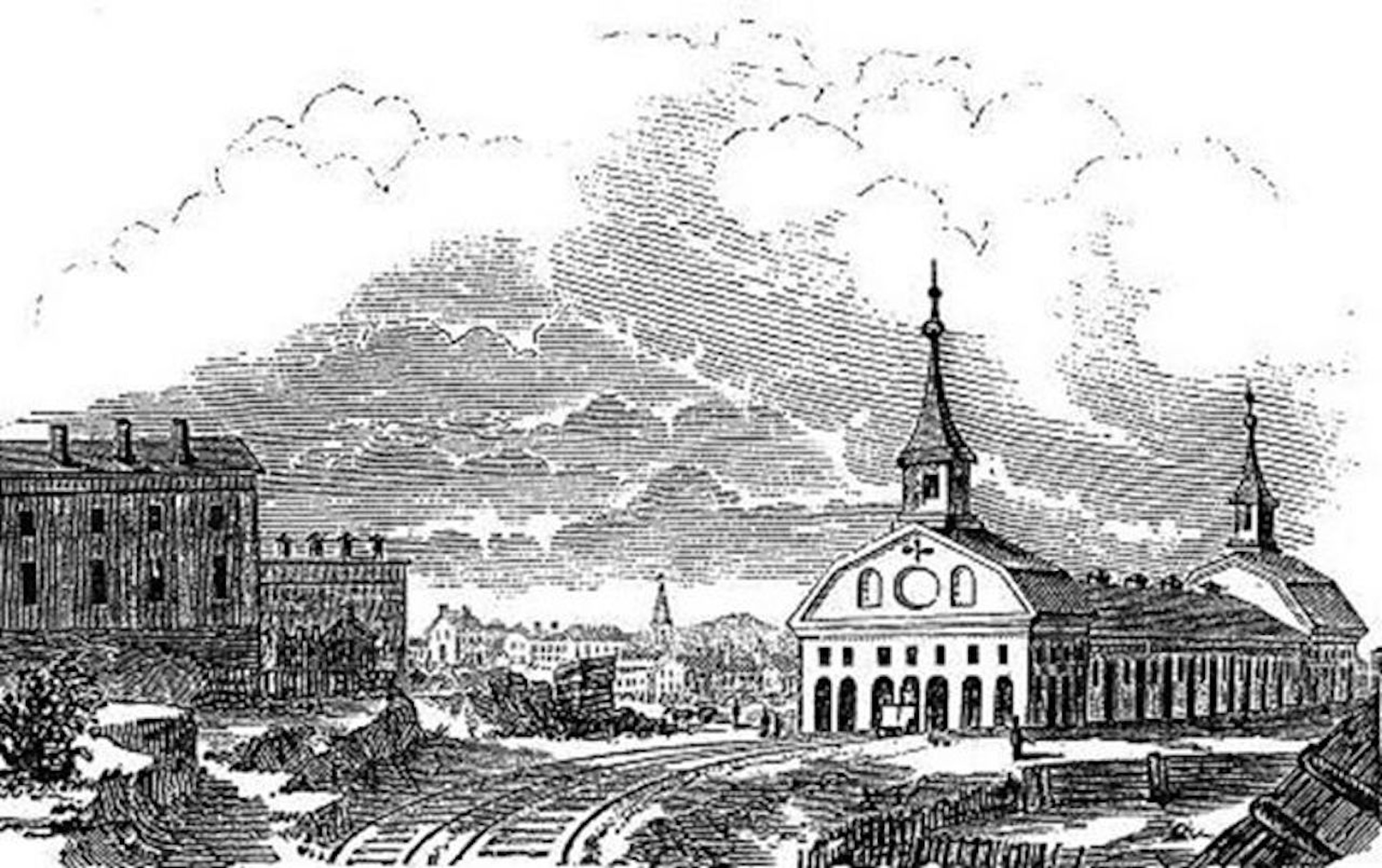 Historic woodcut image of the original CH&D station on Baymiller Street, looking southeast.