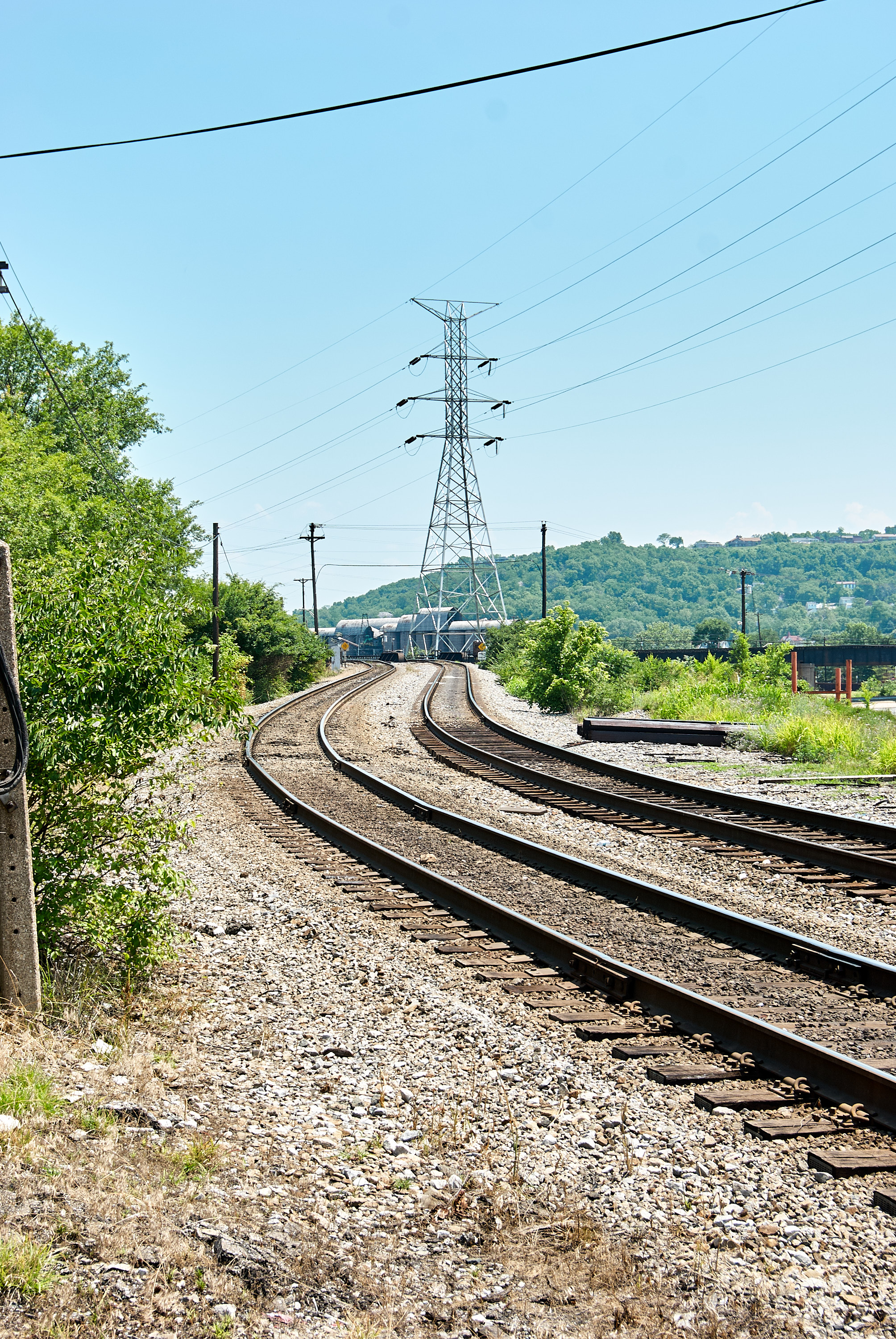 Approach tracks for the C&O viaduct, next to the location of the CH&D station, looking south. Note that while all the old buildings are gone, this s-curve in the tracks is easily identifiable in photos of the rear of the CH&D station.