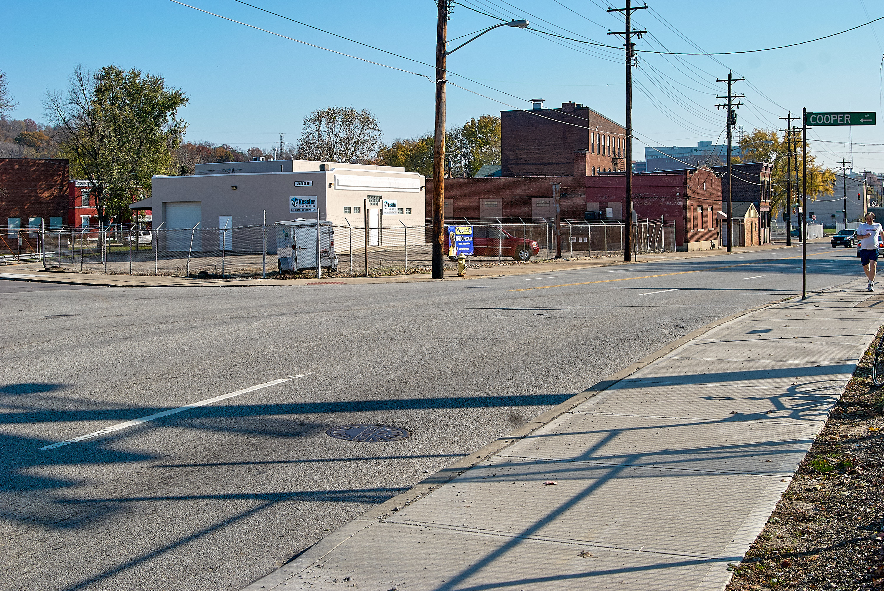 CH&D crossing at Colerain and Cooper in Northside, looking southeast along Colerain. There's a few cracks that can barely be seen in this view, but the gentle hump in the road is the main evidence here.