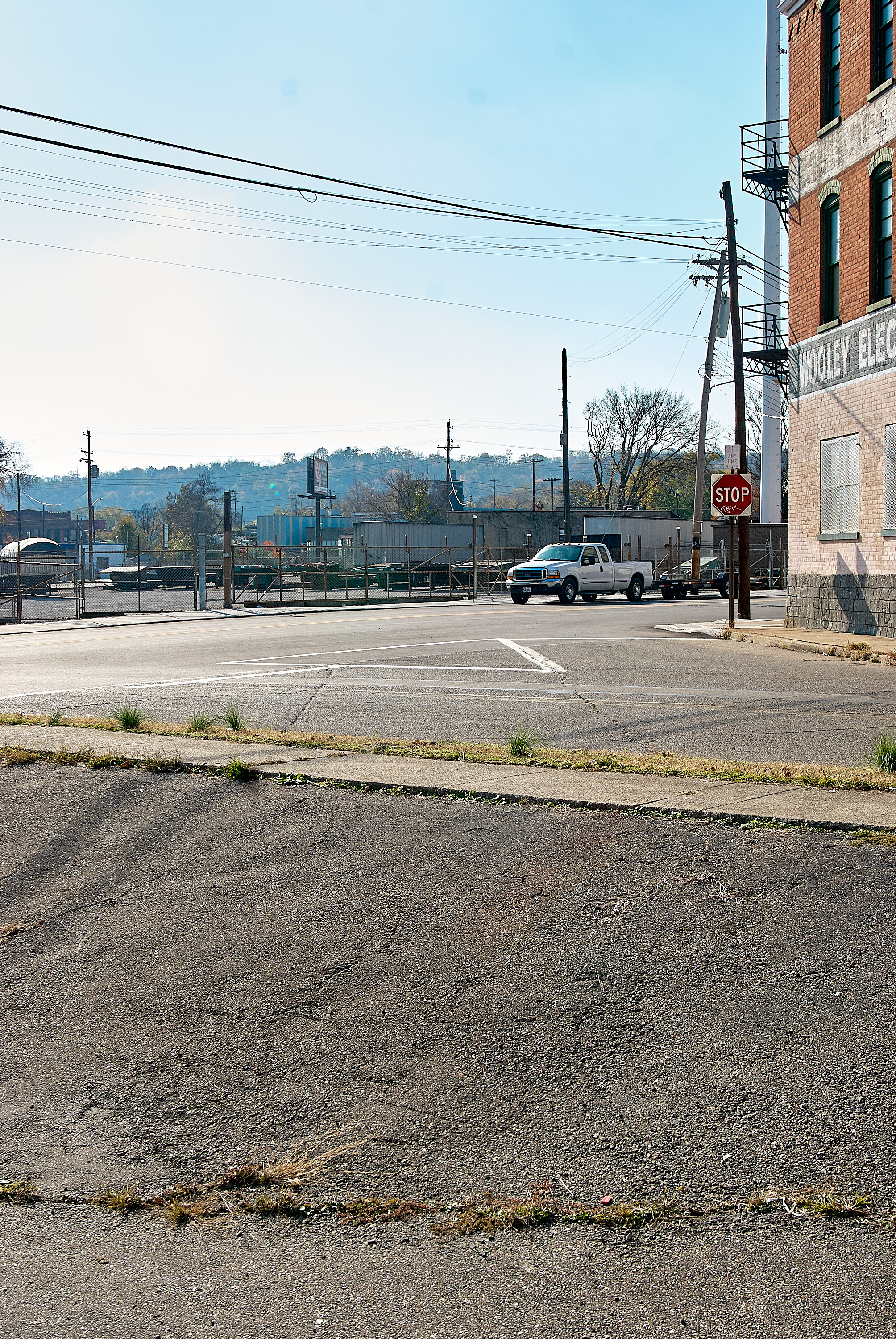 More recent view of the CH&D crossing at Hoffner and Cherry Streets in Northside, looking southwest. Below the sidewalk, the ground has been dug out under the old roadbed.