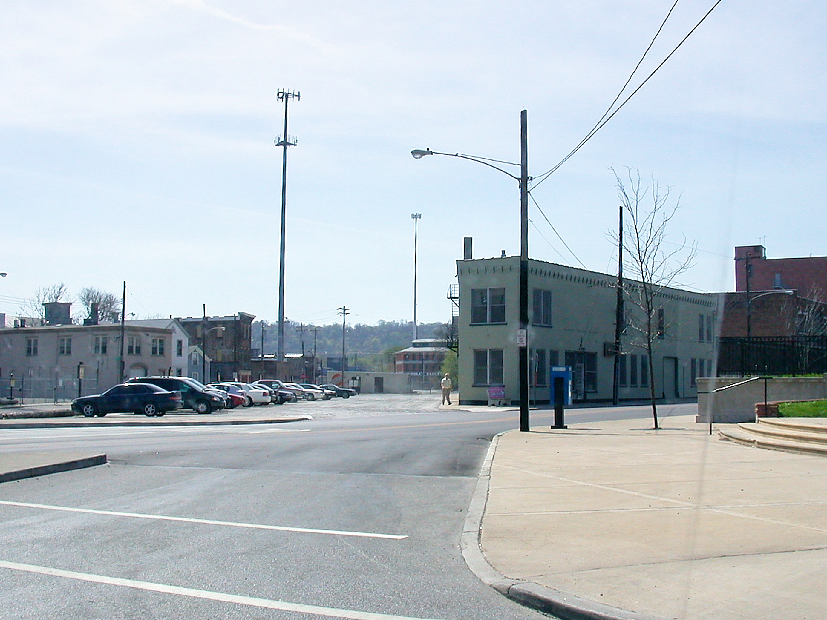 CH&D right-of-way in Northside at Hamilton and Blue Rock, looking southwest from Hamilton Avenue. This right turn slip lane no longer exists.