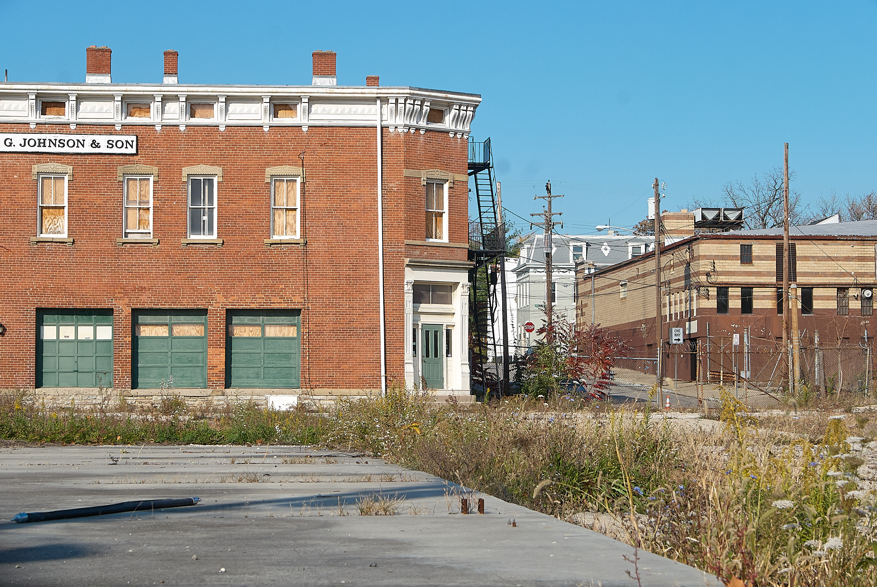 Current view of the location of the CH&D Northside station, looking north towards Langland Street from Blue Rock. This whole area is basically an empty, fenced-off wasteland of weeds and abandoned building foundations. Note that the orange brick building here on the left is also visible in the previous postcard.
