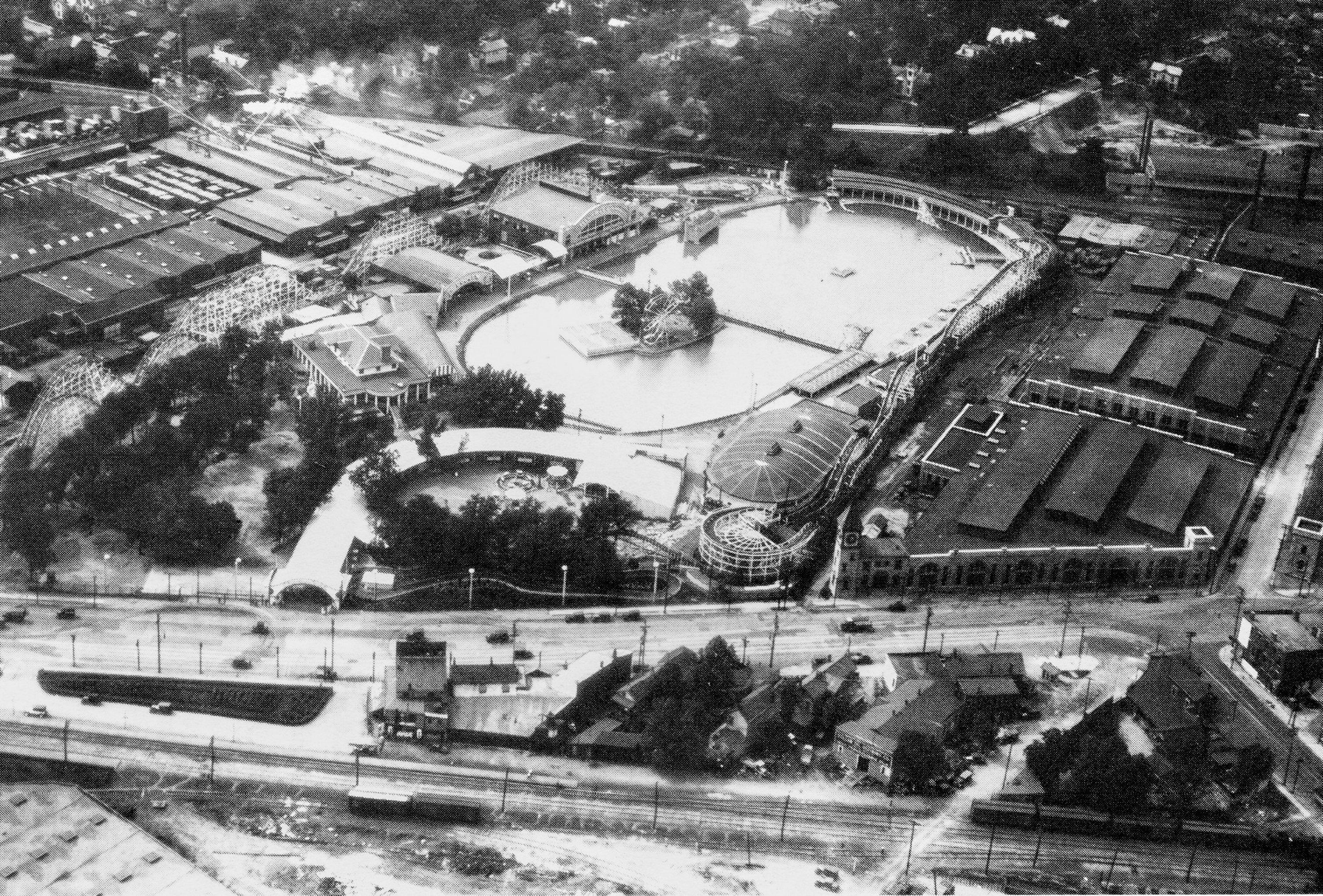 Historic aerial photo of Chester Park and the Cincinnati Car Company buildings in Winton Place, looking northeast across Spring Grove Avenue and the B&O Midland Railroad. Note the streetcar loops at the left side of Spring Grove Avenue. The B&O/CH&D Railroad is at the top, and Mitchell Avenue is at the bottom right.
