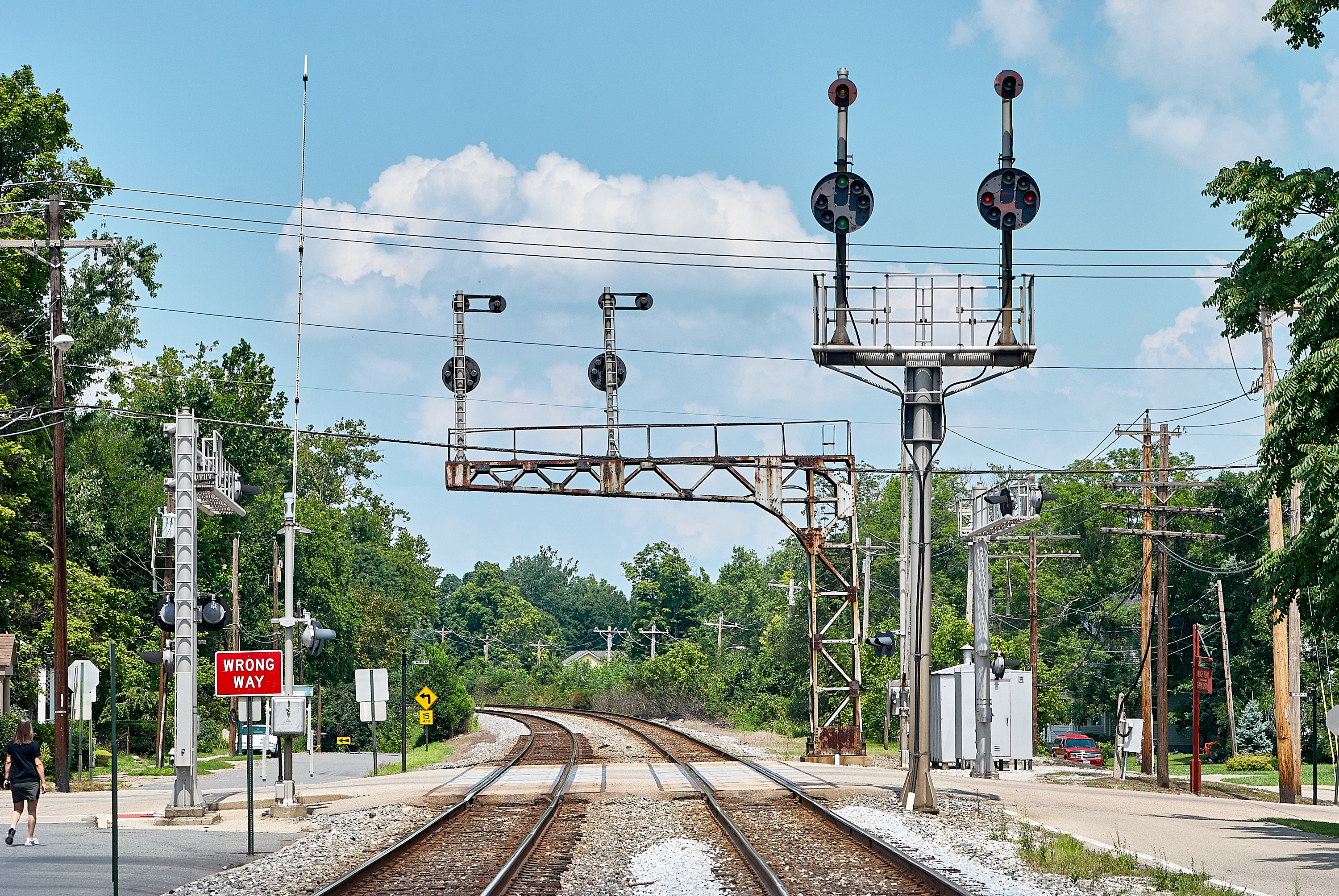 Signals flanking Sharon Road in Glendale, looking north from near the station. These signals and the overhead gantries have been replaced.