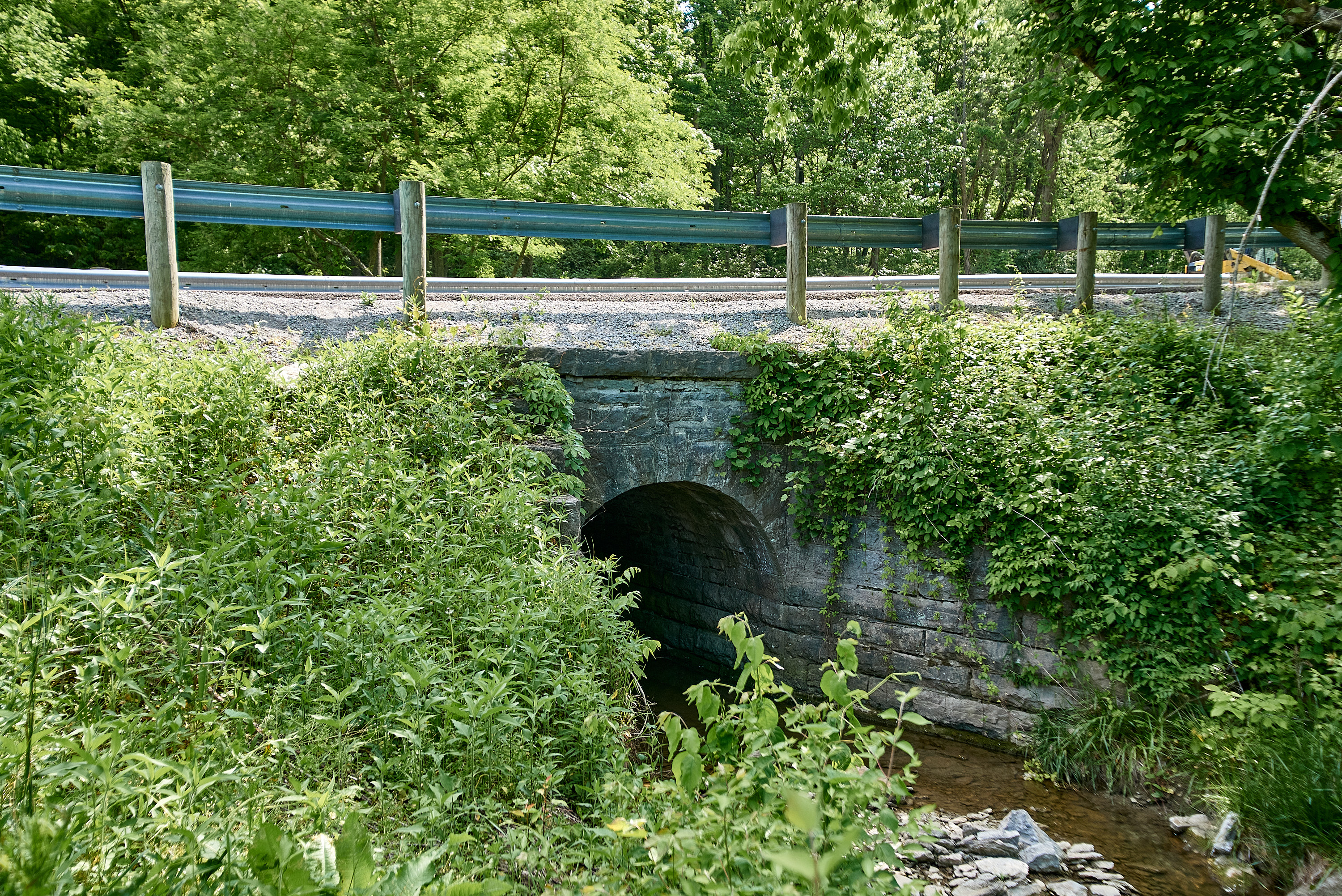 Former CH&D East Middletown Branch culvert over Kennedy Creek in Rentschler Forest Metropark north of Hamilton, looking south. This park road now occupies the location of the railroad, which was generally on the heelpath side of the Miami & Erie Canal.