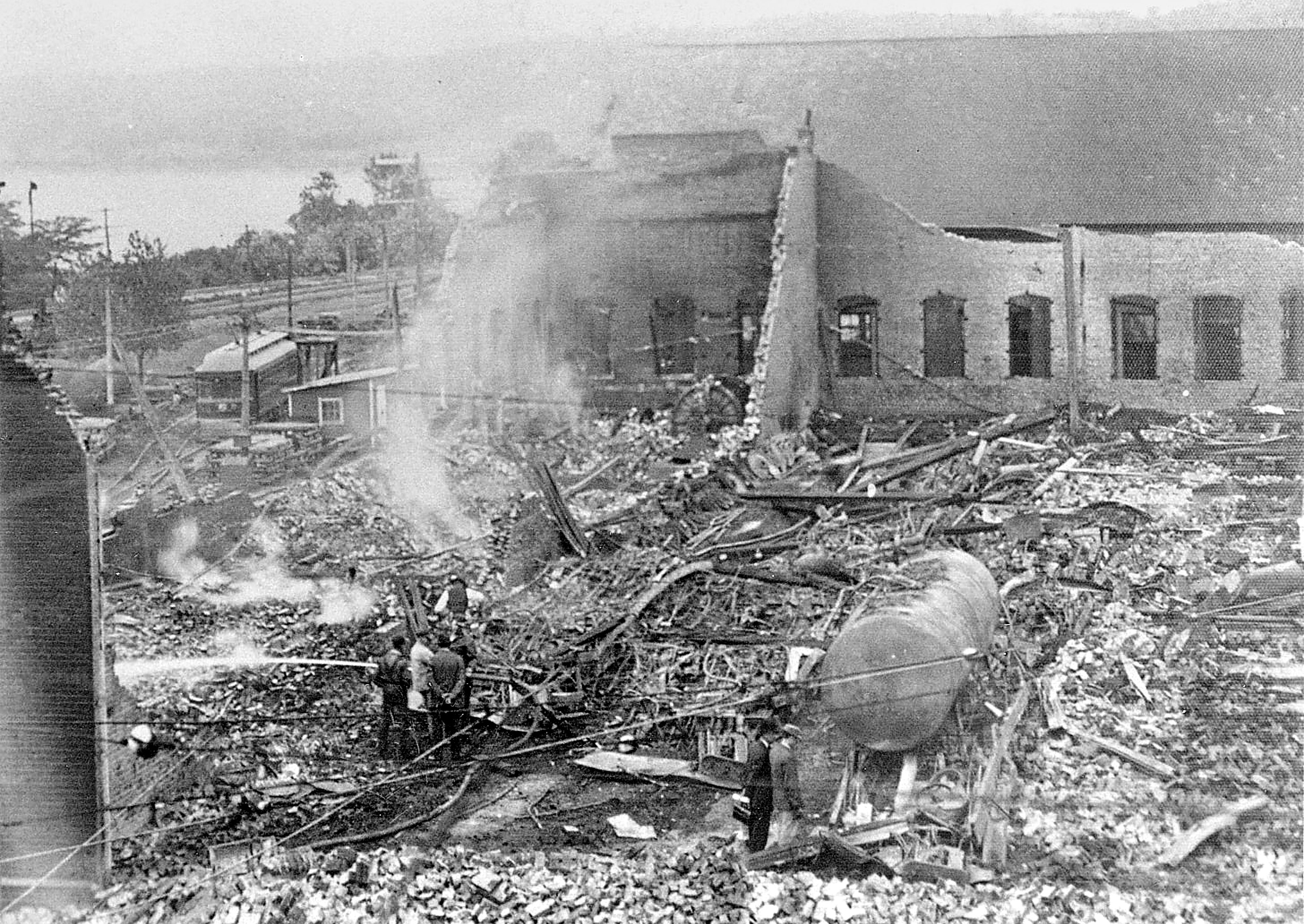 Historic photo of the CL&A carbarn and power house after the explosion and fire in 1915, looking west. Note the car and track on the left, and the Ohio River in the background.