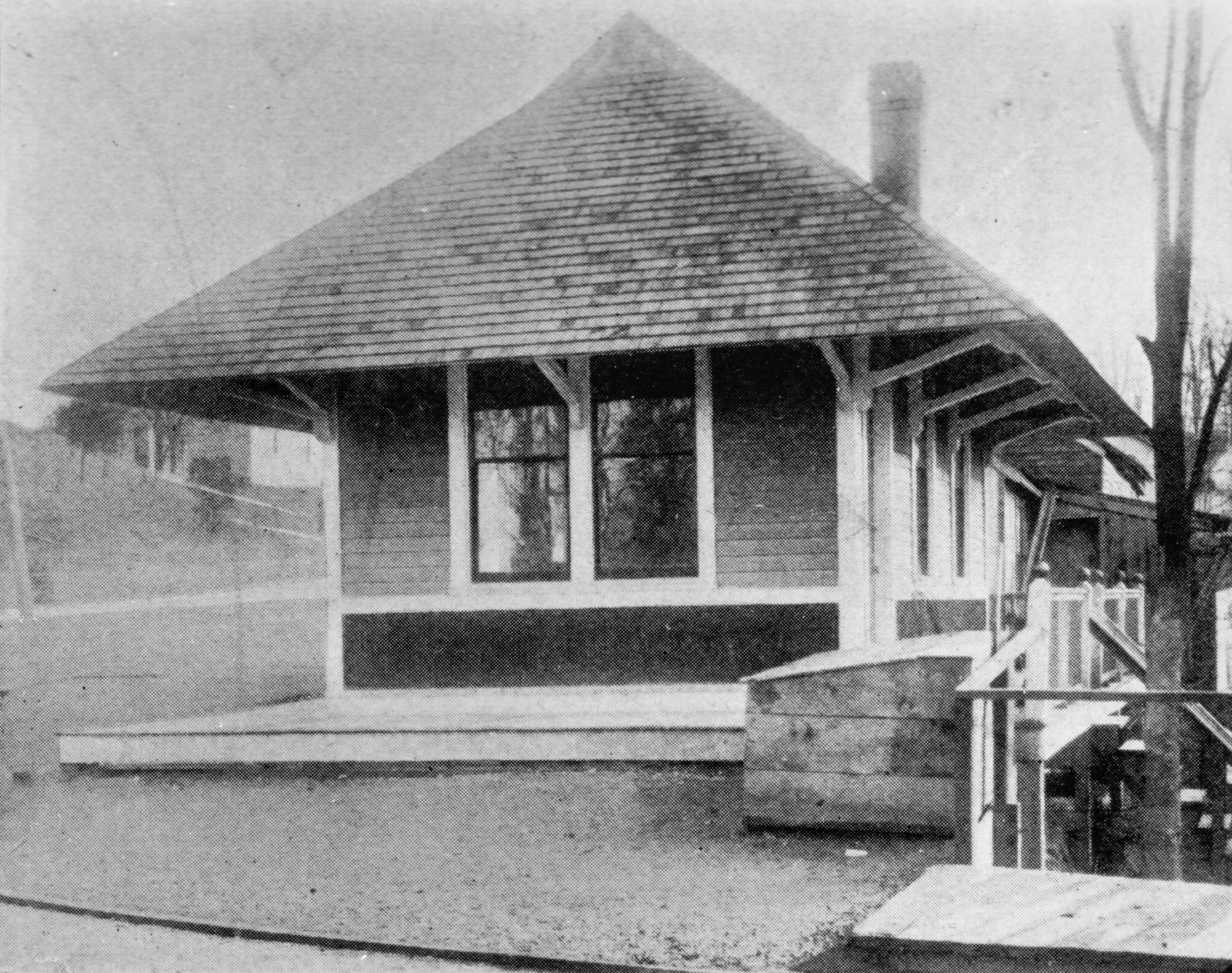 Historic photo of the CL&A Cleves Junction station, which was only used for three years before the tracks were rerouted, looking south. Miami Avenue is to the left, and to the right the ground drops off precipitously to the Big Four railroad cut. The plank sidewalk at the bottom right is the start of a trestle that crossed the cut. From "Along the Line," a promotional booklet published by the CL&A, provided by Bill Van Doren.