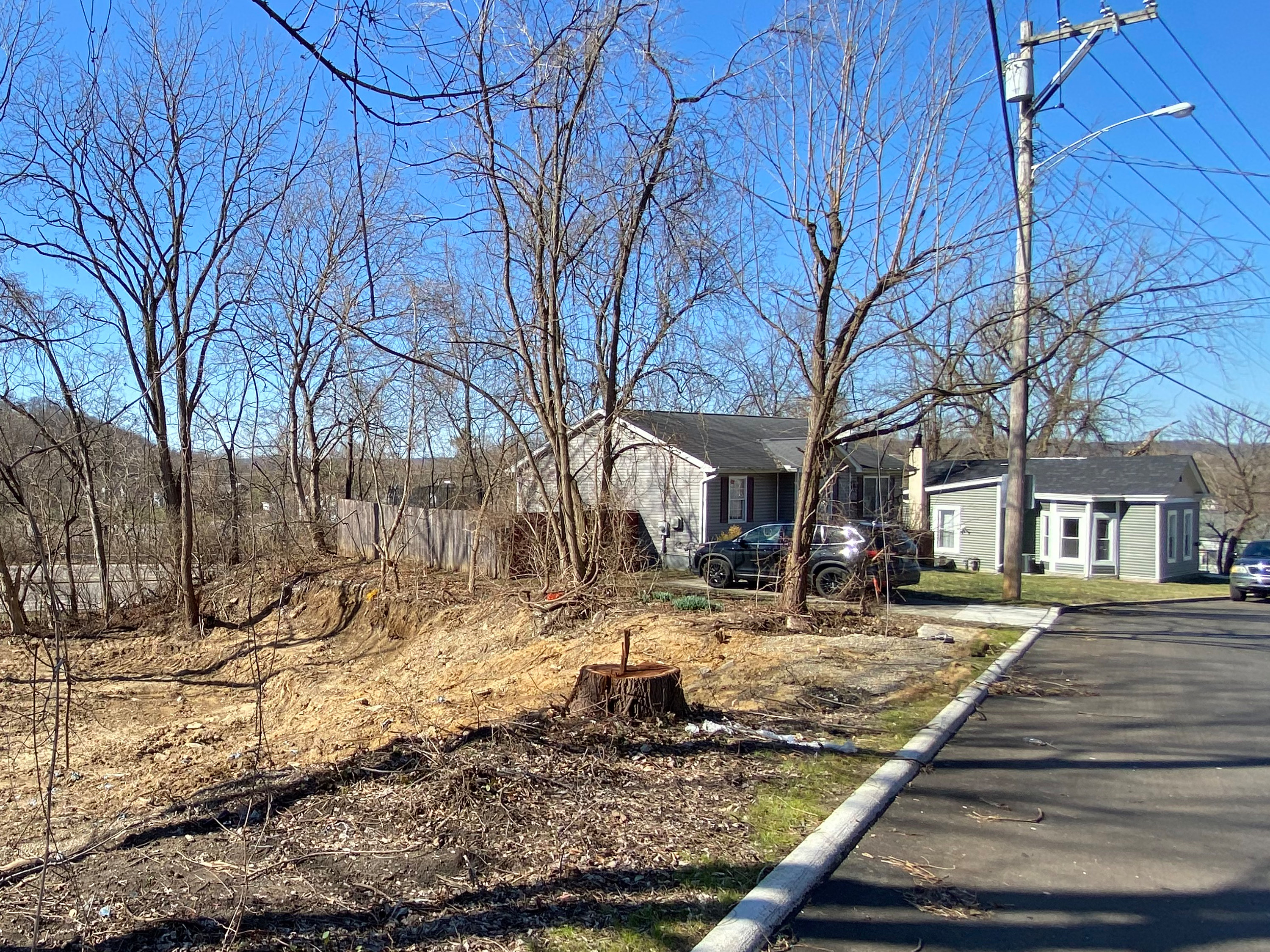 Current photo of the CL&A Cleves Junction station location. The tree stump at center would appear to be the same tree from the previous photo. Note that the house with the black SUV in the driveway has been replaced since the photo from the 1990s but the house to the right remains.