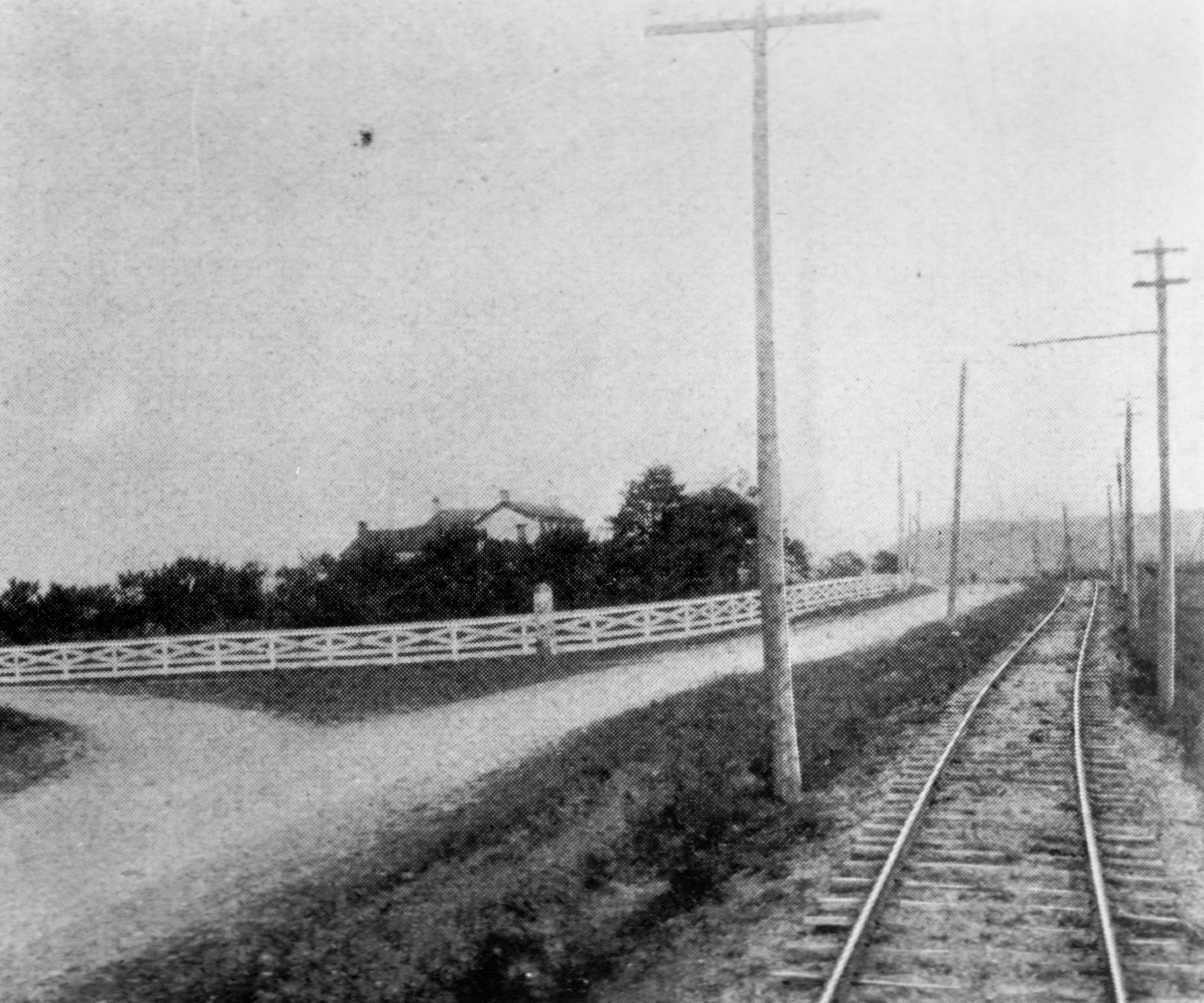 Historic photo of CL&A tracks along US-50 Louisville Pike at State Line Road, looking east. The substation from the previous photos would later be built to the right of this view. The farmhouse behind the fence remains today. This was stop #71. From "Along the Line," a promotional booklet published by the CL&A, provided by Bill Van Doren.