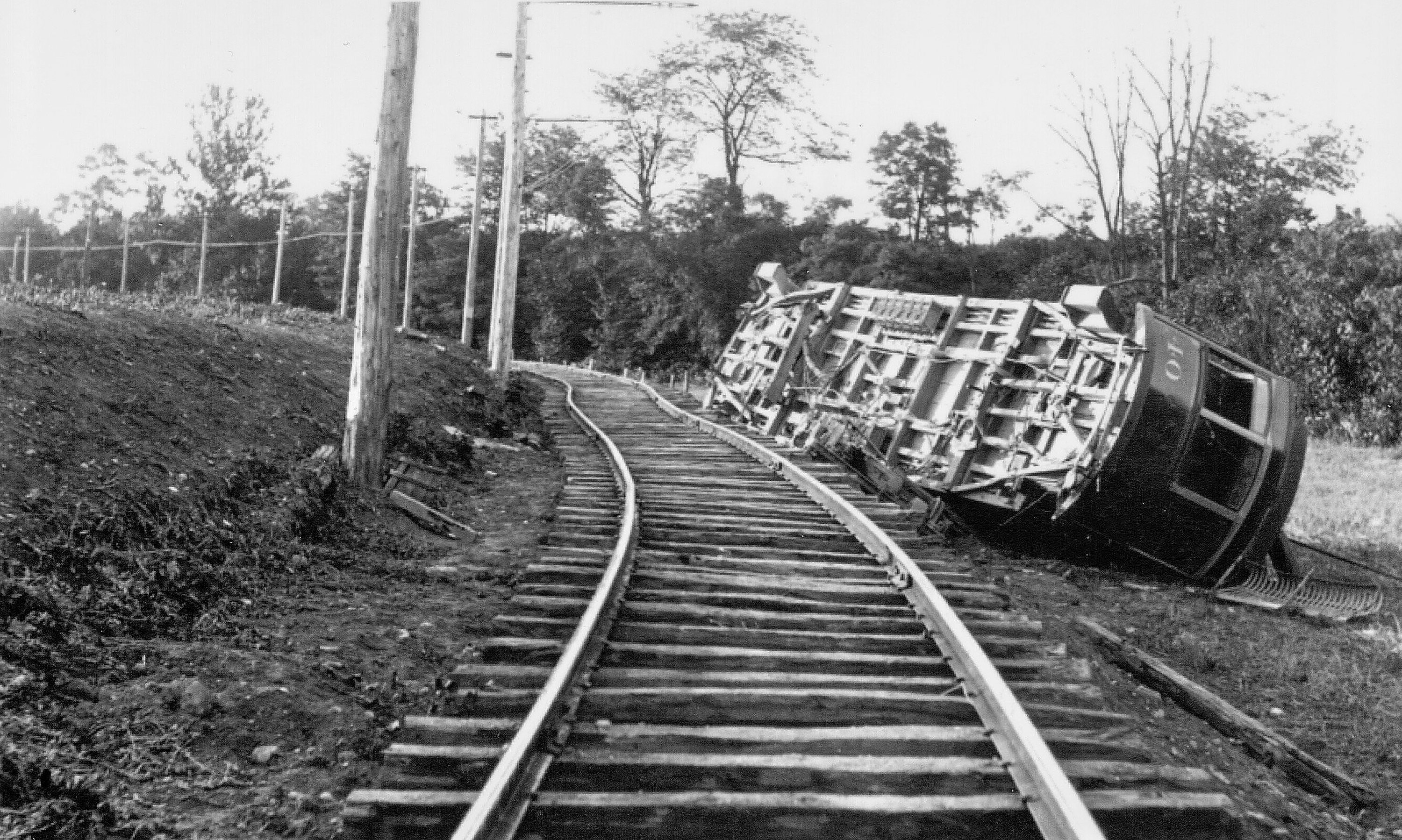 Historic photo of a wreck at the gravel pit near Harrison due to a spread rail. This was apparently on July 4, 1900, opening day of the Harrison Branch. Note how the track hasn't been ballasted yet. From the Cliff Scholes collection, provided by Bill Van Doren.