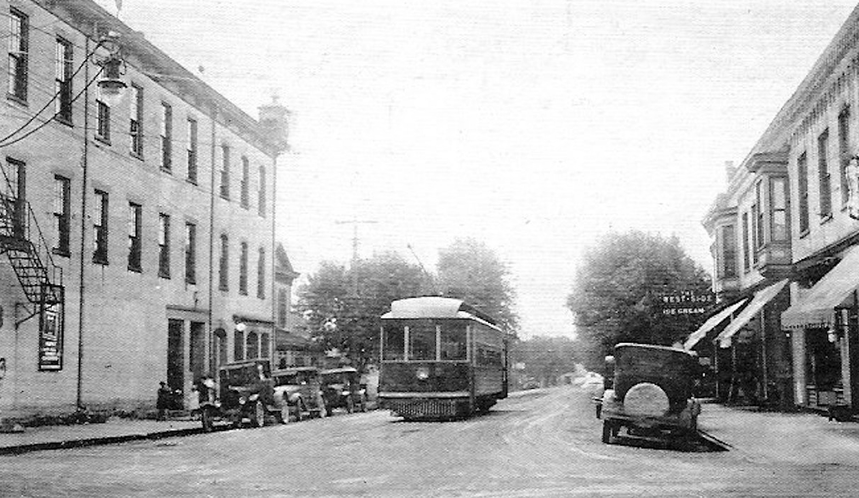 Historic photo showing the CL&A in Harrison, looking south from Harrison Avenue. The buildings on the right and left remain in 2022.