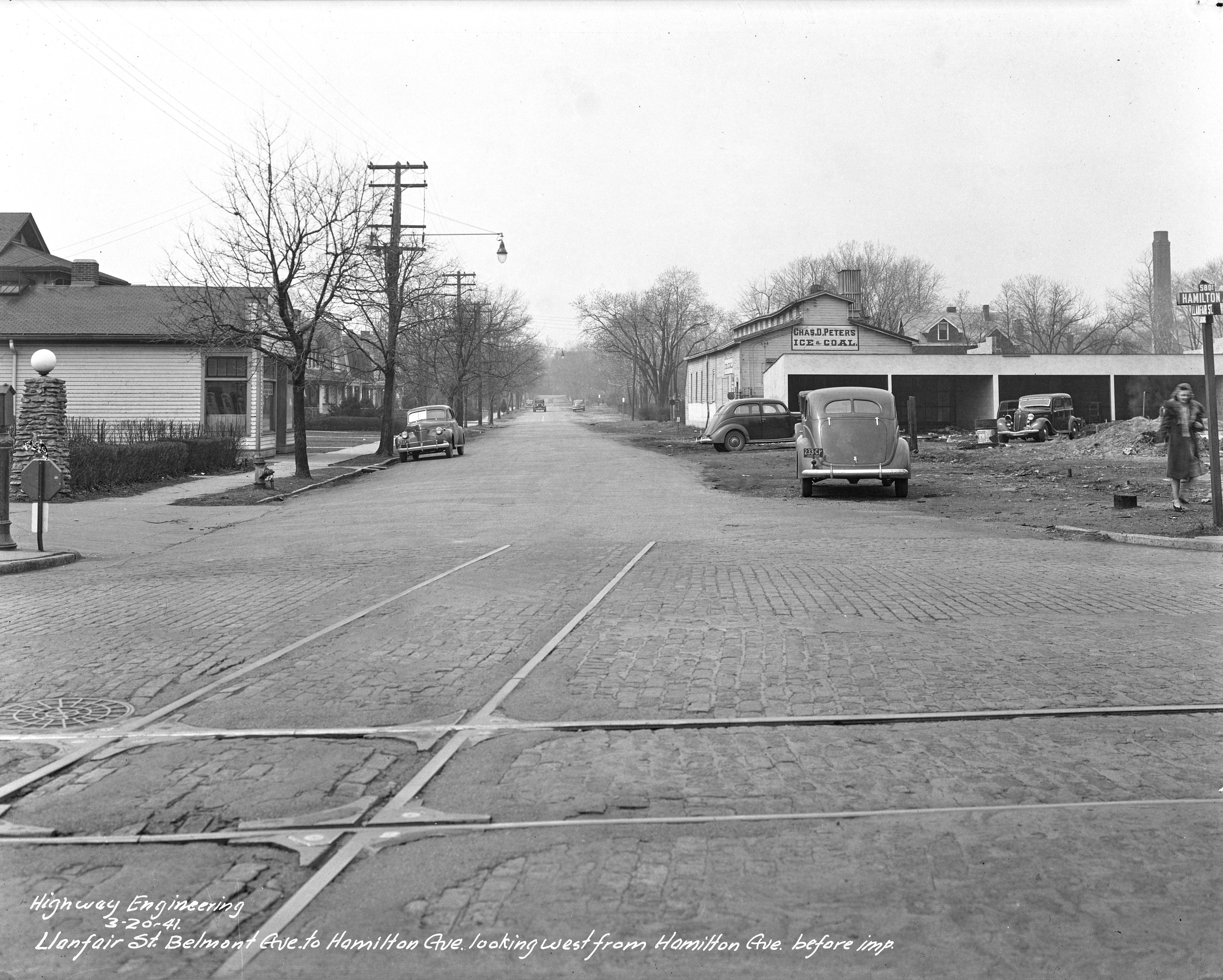 Historic photo of the C&LE freight branch crossing Hamilton Avenue onto Llanfair in College Hill, looking west. The track continuing ahead was for the original College Hill Railroad and later Cincinnati & Northwestern. The tracks ran to the right/north side of Llanfair in the dirt. After it was converted from a steam railroad into an interurban, the main line turned north behind the vantage point of this photo. The track crossing from left to right is the southbound track for the Hamilton Avenue car line of the Cincinnati Street Railway. From the University of Cincinnati Library Digital Resource Commons, Street Construction and Improvements collection.