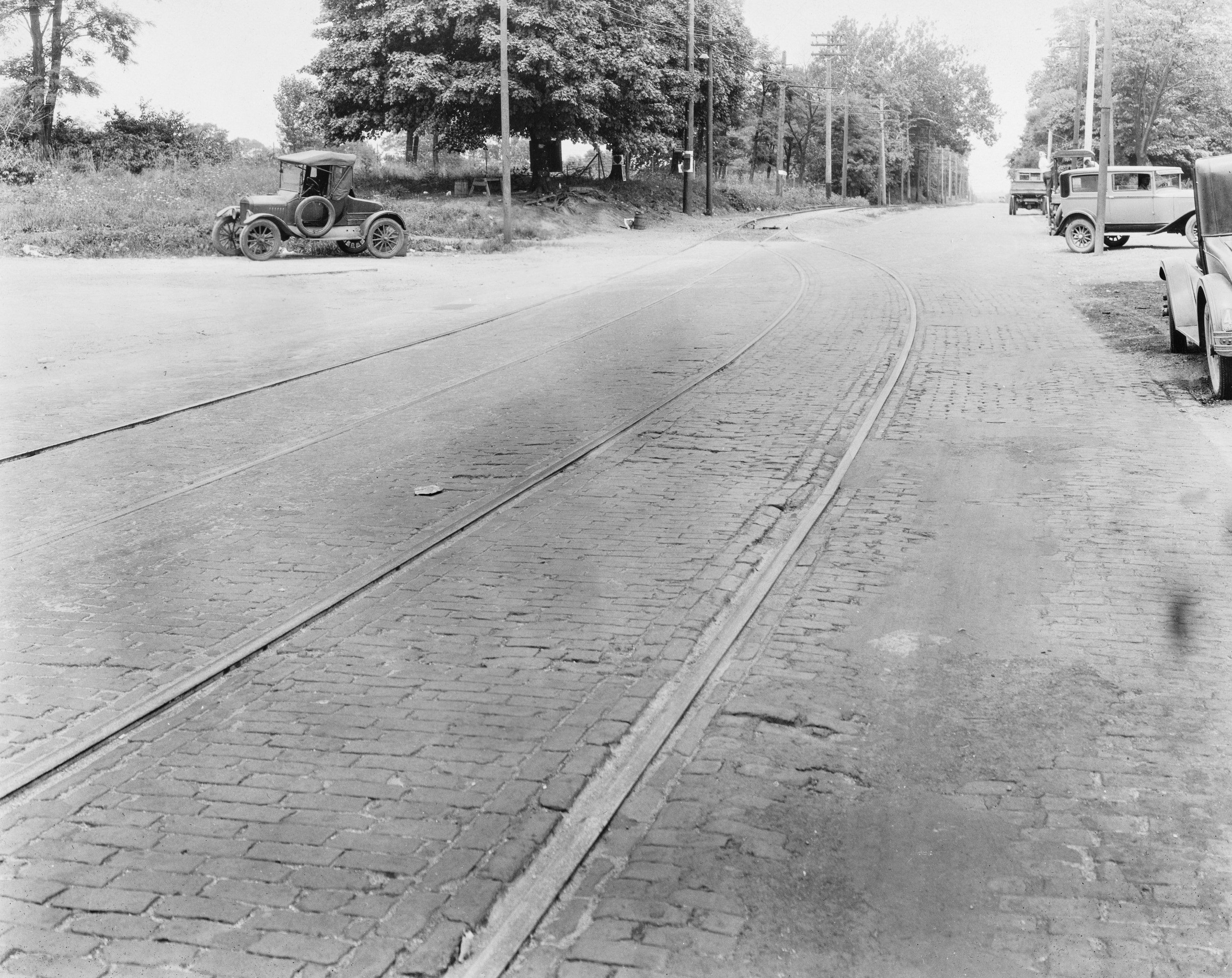 Historic photo of C&LE tracks at Hamilton Avenue and North Bend Road in College Hill, looking north along Hamilton from North Bend. Note how the double track merges to a single track and moves to the side of the road. From the University of Cincinnati Library Digital Resource Commons, Street Construction and Improvements collection.