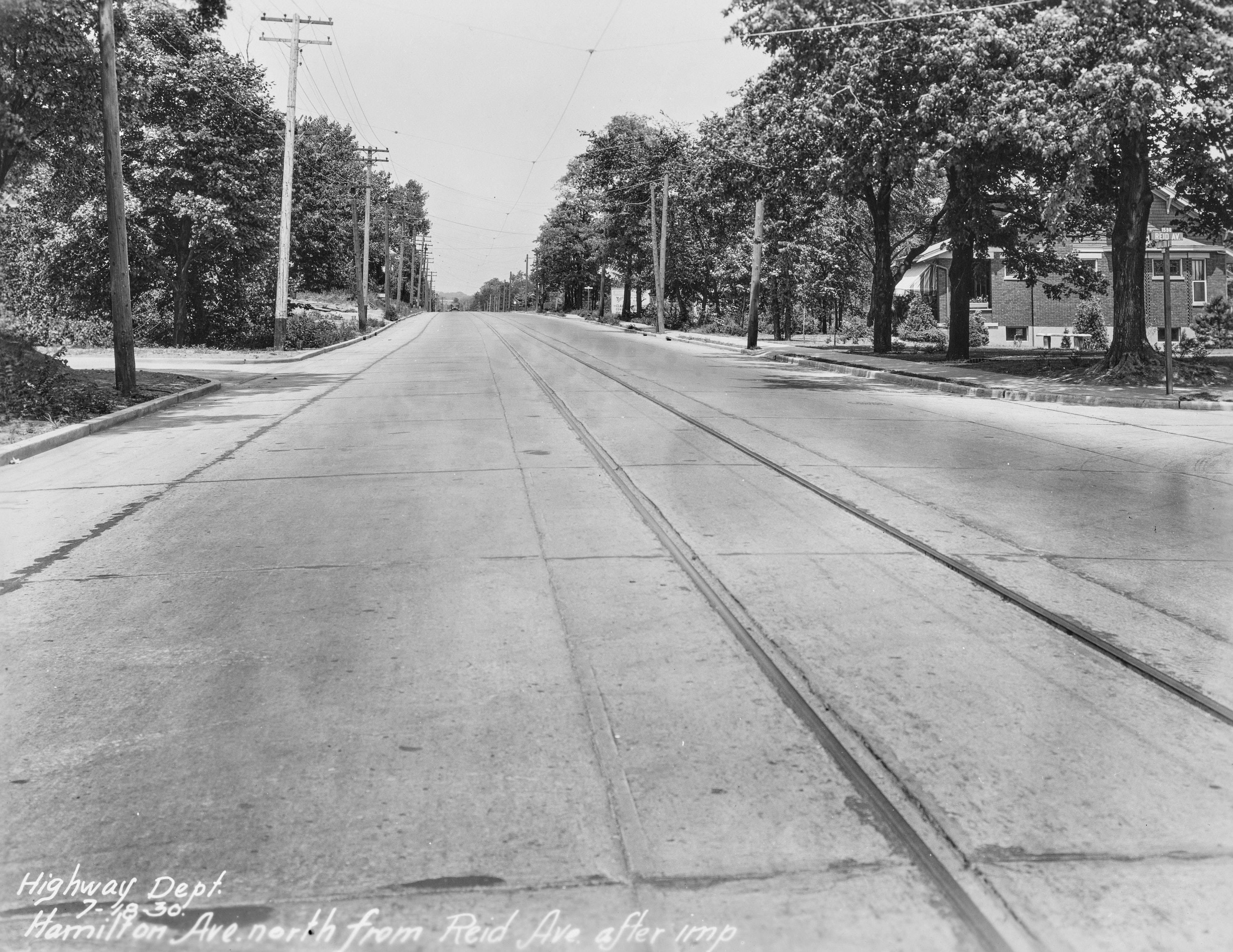 Historic photo of C&LE tracks at Hamilton and Reid Avenues in College Hill after repaving, looking north along Hamilton. By the time this photo was taken there had been over a decade of interurban abandonments, in many cases to facilitate street widening like this. However, since the C&LE was newly formed and very much under operation at this time, the tracks were rebuilt in the middle of the street even though the original side of the road right-of-way was removed to make the street wider. From the University of Cincinnati Library Digital Resource Commons, Street Construction and Improvements collection.