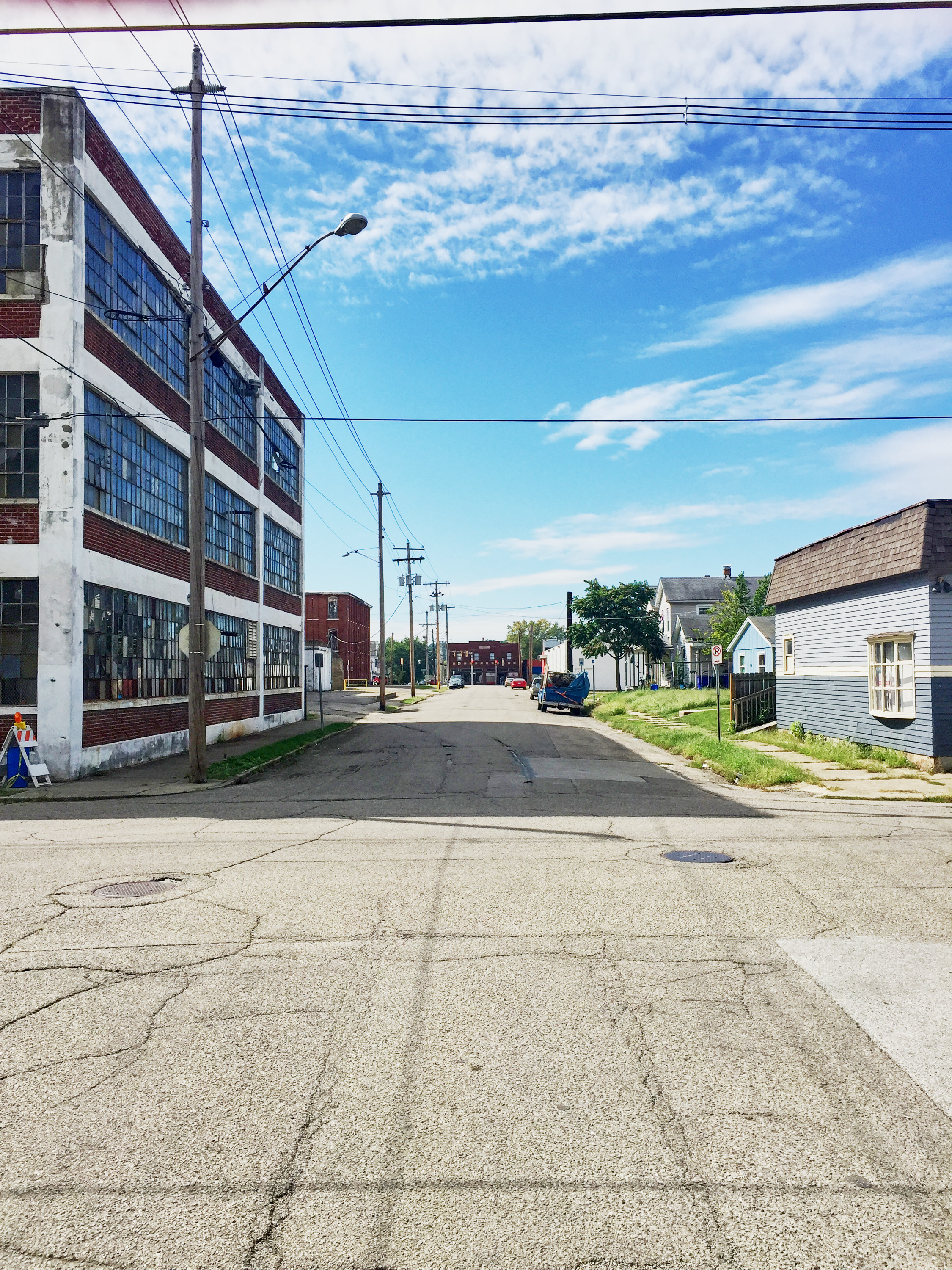 C&LE freight spur at the former Shuler & Benninghofen Woolen Mill in Hamilton's Lindenwald neighborhood, looking west down Williams from the intersection at Benninghoffen. Note that while the track beyond the turnout appears to be gone, as there's no indication of a switch, nor in the intersection for the track that once went down Benninghofen to Laurel, the flat spot in the middle of the street remains in the distance.