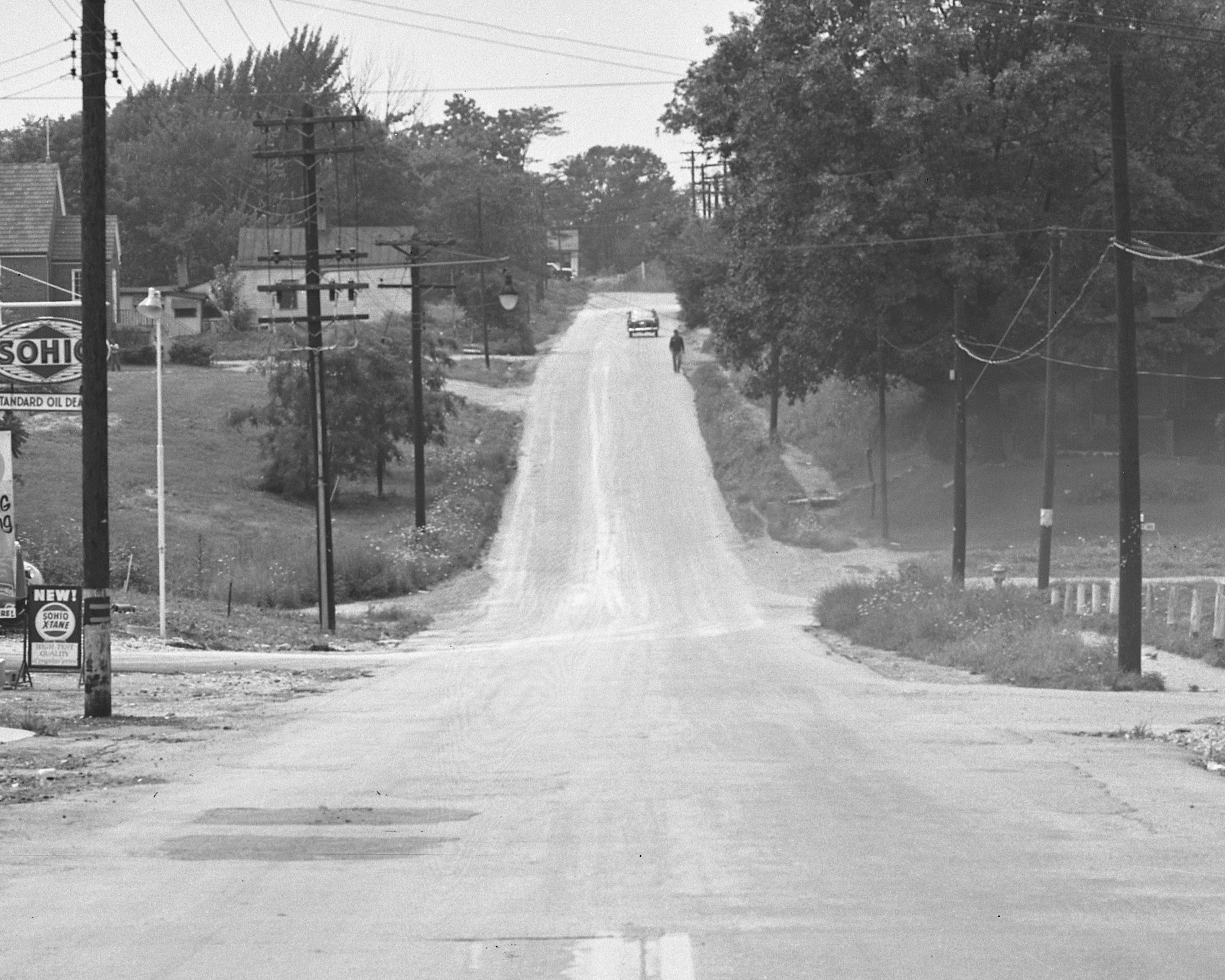 Close-up of the previous photo of the C&LE freight branch crossing at North Bend Road, looking west. The gravel driveways to the left and right at the bottom of the hill are the remains of the right-of-way. From the University of Cincinnati Library Digital Resource Commons, Street Construction and Improvements collection.