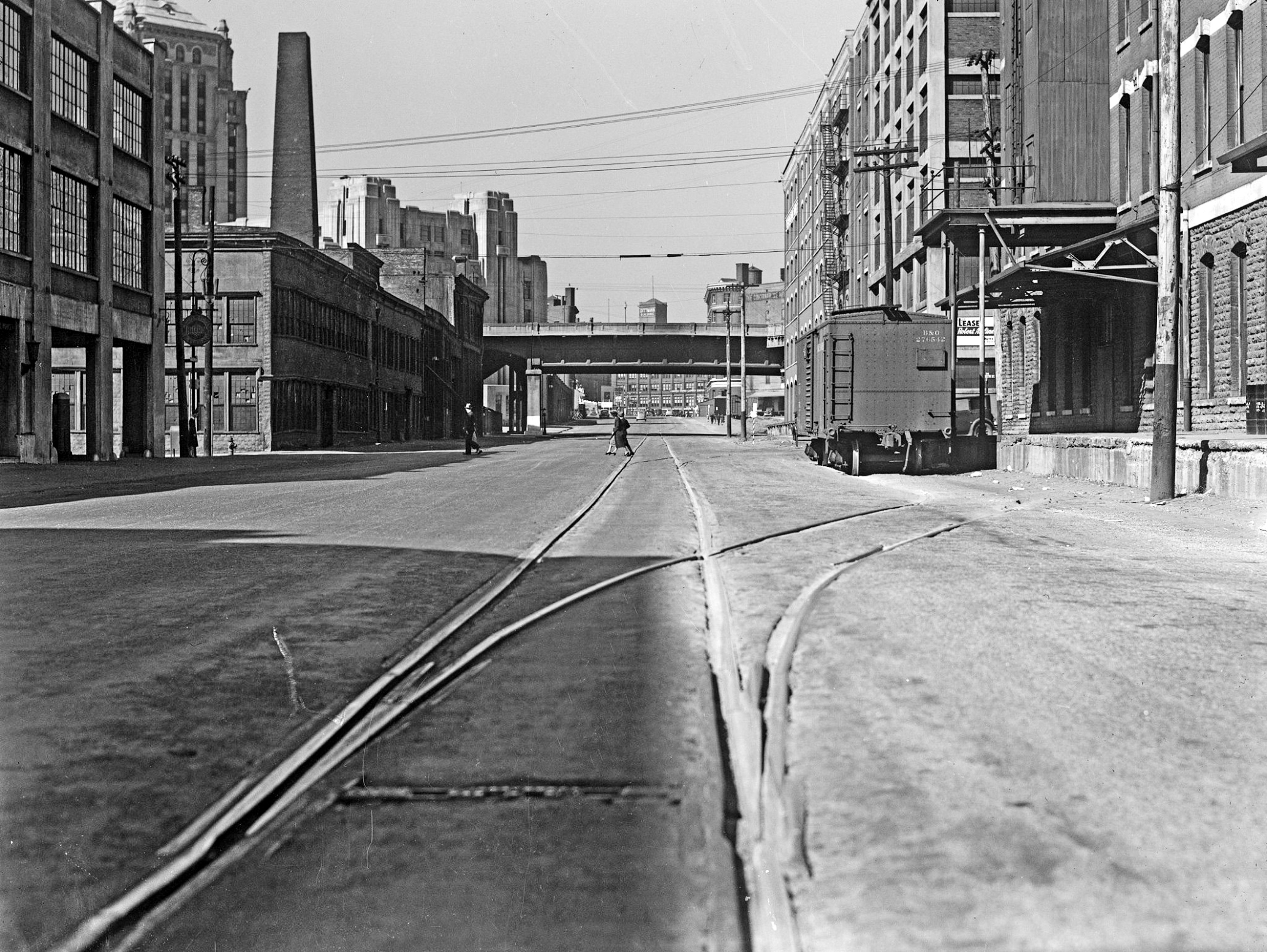 Historic photo of PRR/CL&N freight tracks on Eggleston Avenue, looking northwest towards the Gilbert Avenue Viaduct from between 5th and 6th Streets.