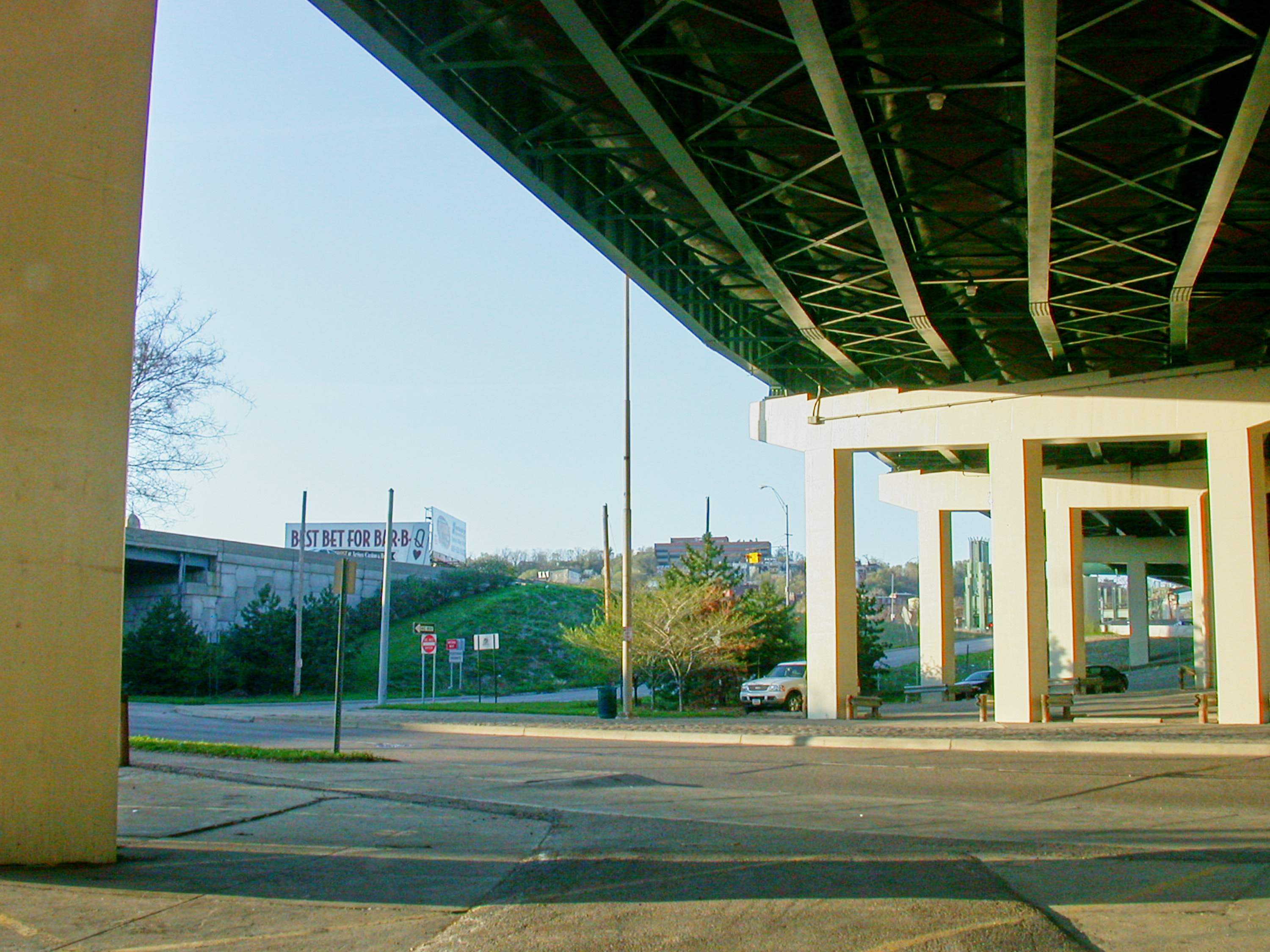 PRR/CL&N freight spur, looking northeast towards Eggleston Avenue from the vantage point of the last picture, with I-71 overhead. The asphalt strip at the bottom marks the location of the buried tracks, which can be seen curving gently to the left.