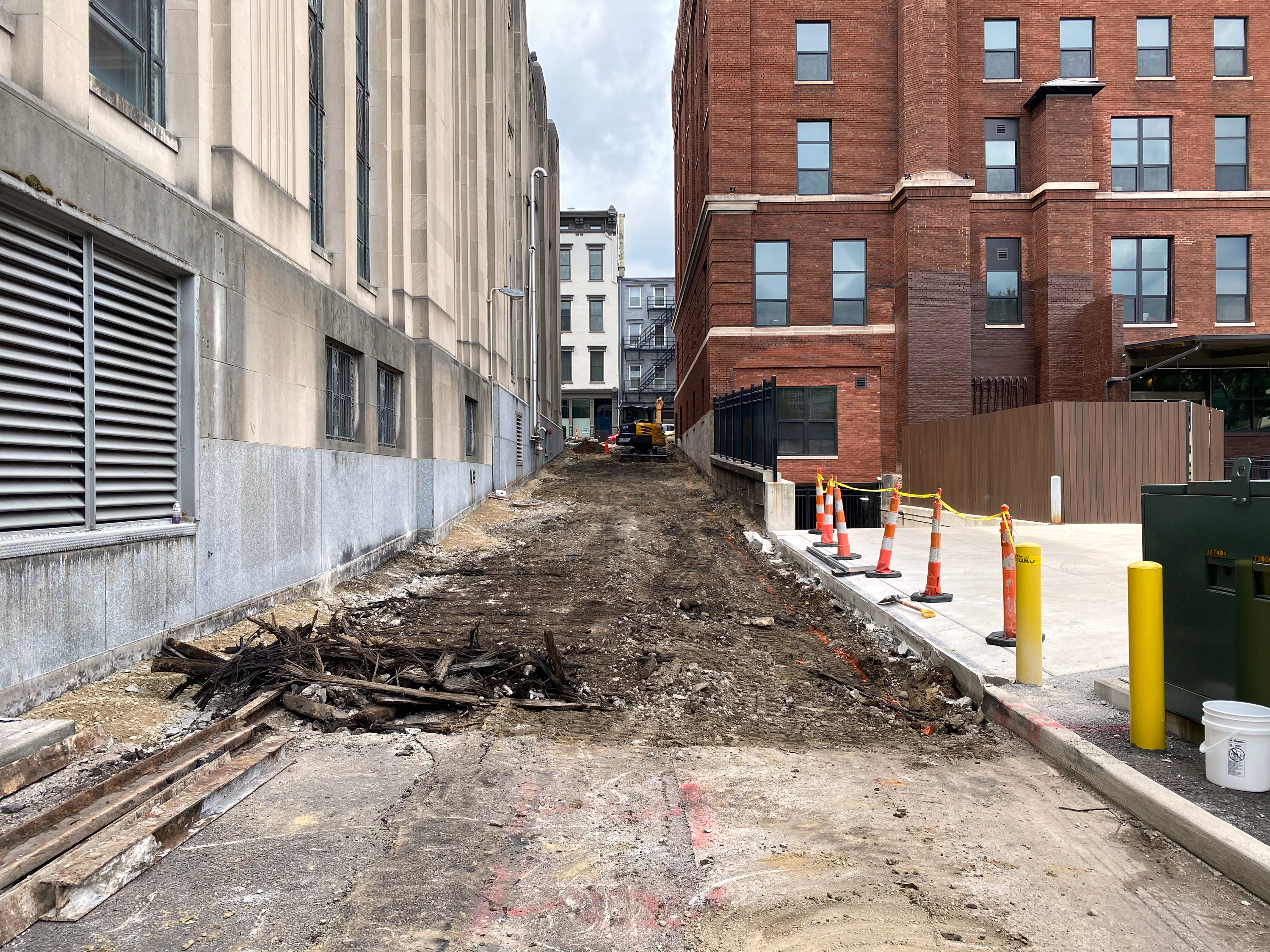 Construction on Bedinger Street reveals an old industrial rail spur from the CL&N next to the Times-Star Building, looking west.