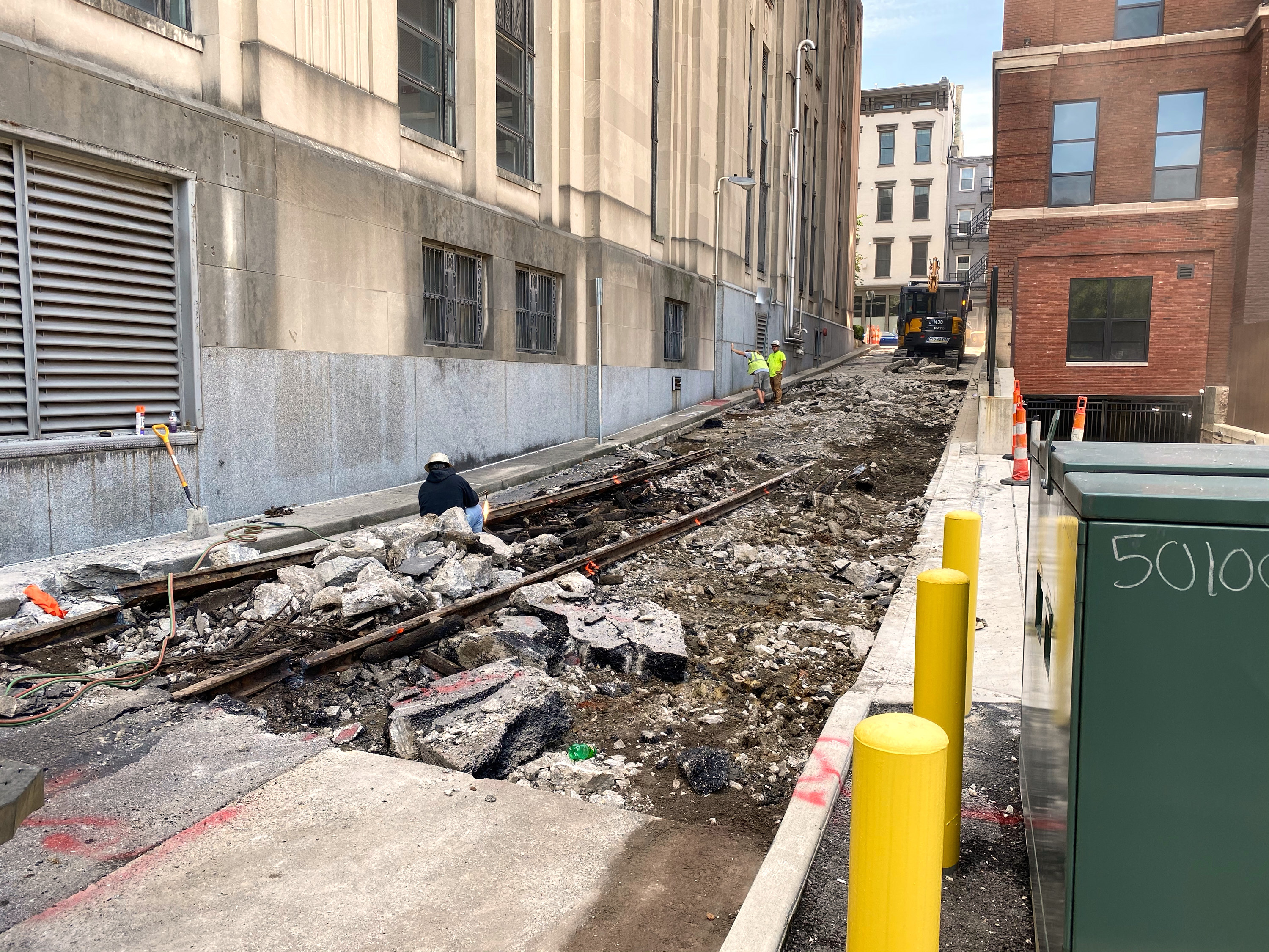 Construction on Bedinger Street reveals an old industrial rail spur from the CL&N next to the Times-Star Building, looking southwest. Photo by Travis Estell