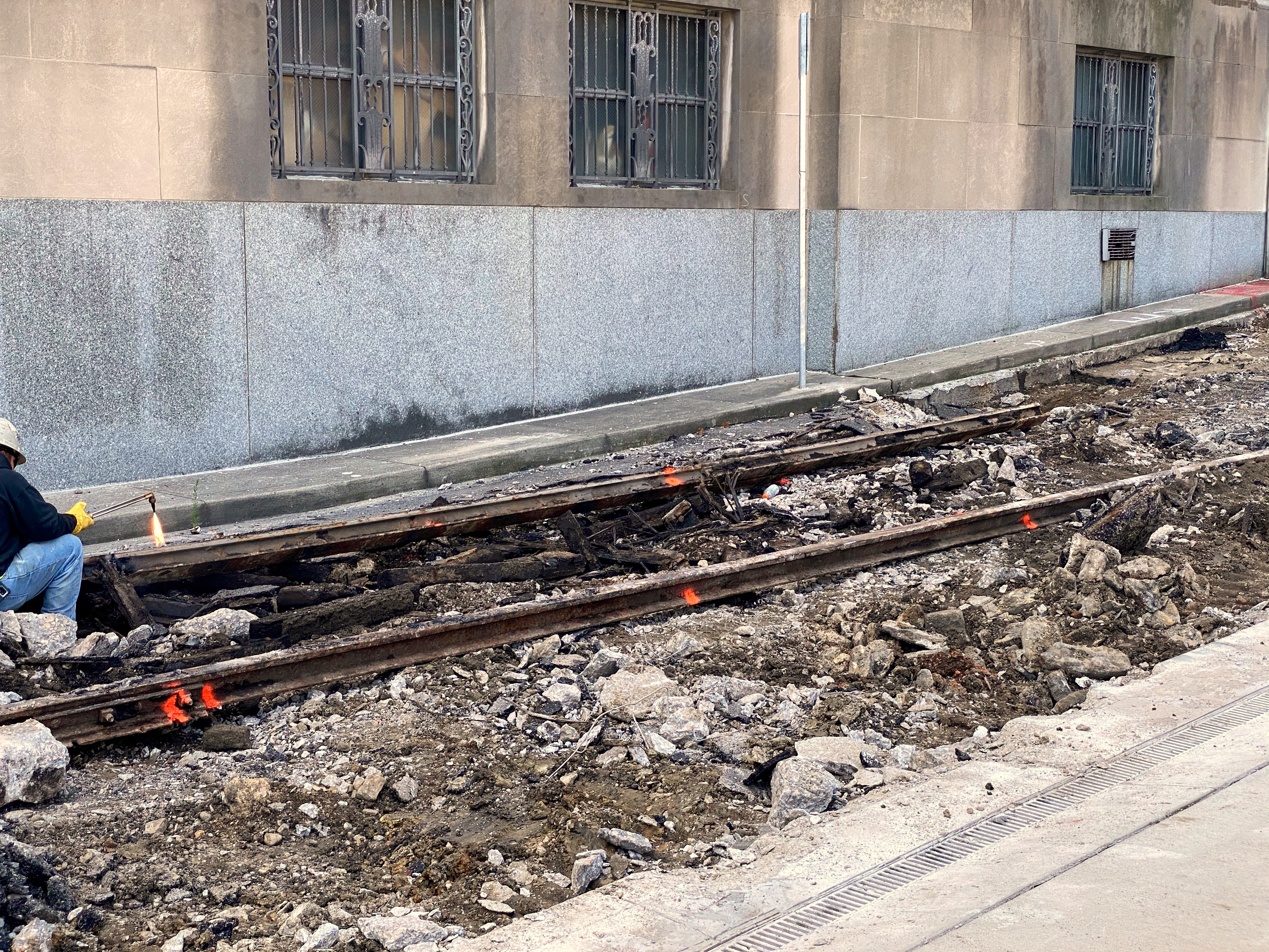 Construction on Bedinger Street reveals an old industrial rail spur from the CL&N next to the Times-Star Building, looking southwest. Photo by Travis Estell