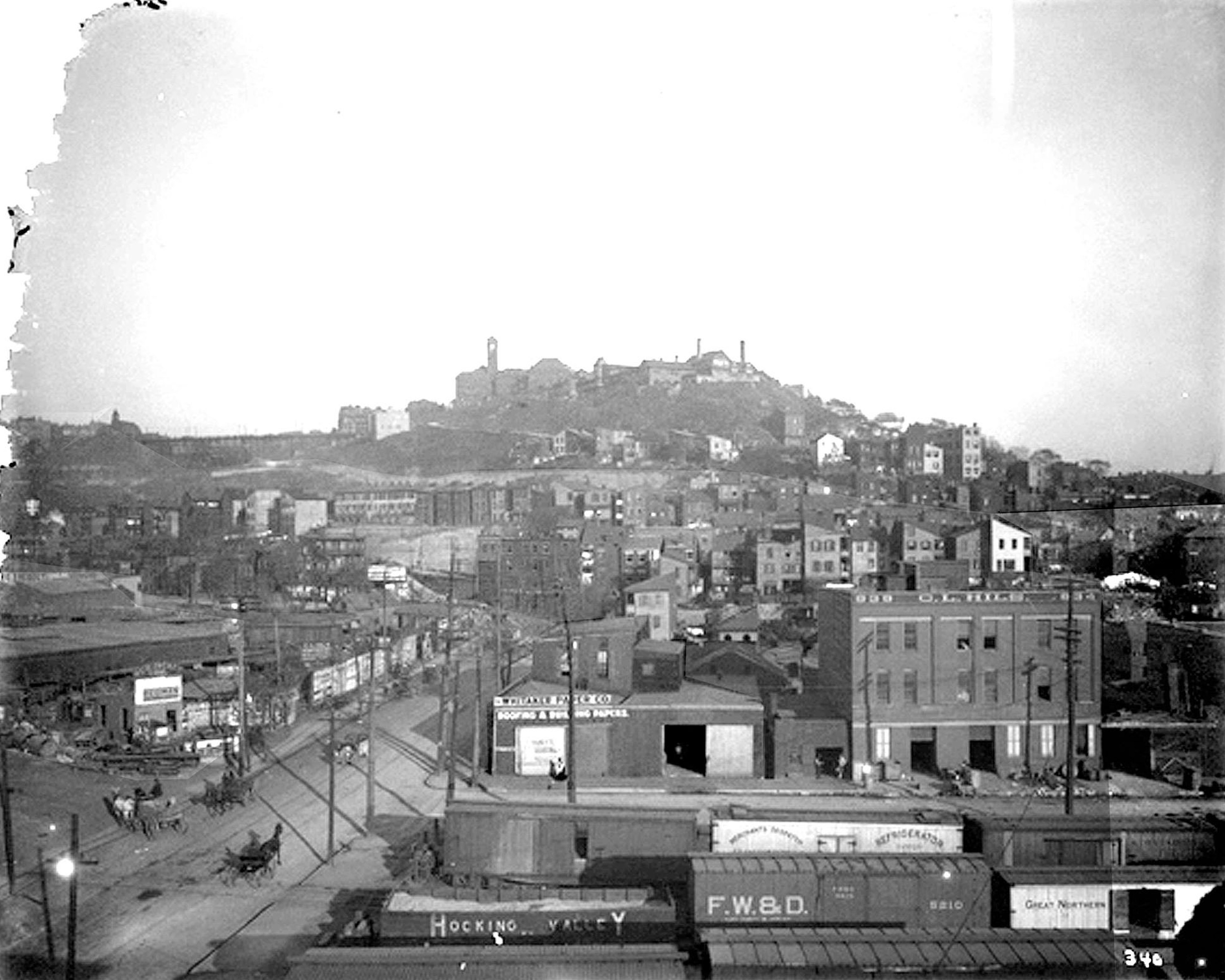 Historic photo of the CL&N freight depot at Court and Reedy Streets, looking east with Mt. Adams in the background. The track crossing Court on its way to Eggleston is at the bottom left. The passenger station is out of the photo to the left. The rail cars at the bottom are in a small freight yard.