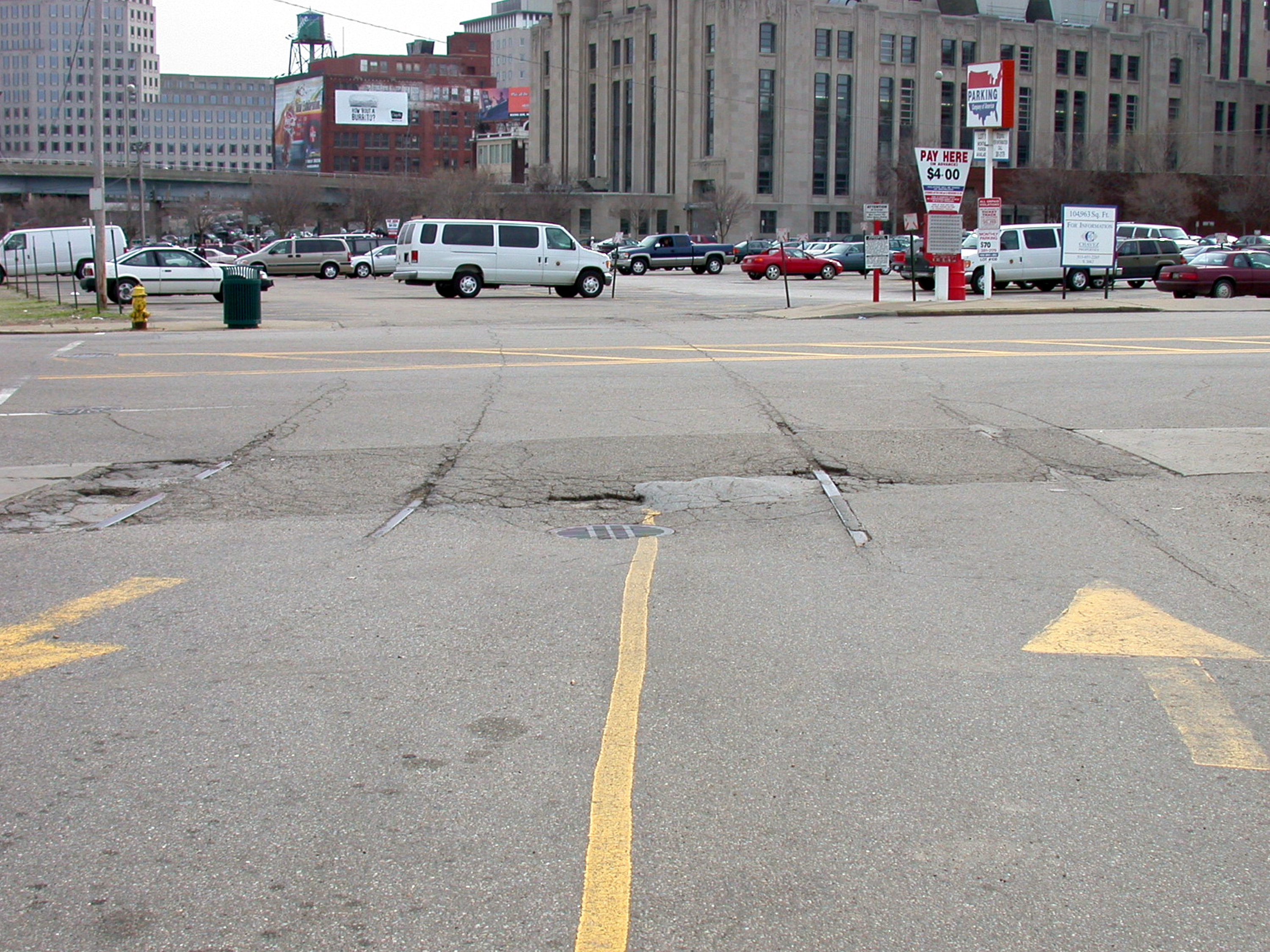 CL&N tracks crossing Court Street, looking south from the former entrance to the Broadway Commons parking lot. Proctor and Gamble's downtown headquarters is at the top left. This crossing was the site of many battles between the city and the early CL&N, as this was the main access to Gilbert Avenue, the busiest street northeast out of downtown. There were fears about runaway trains coming down the hill and crashing into crossing horsecars and cable cars, as well as the multitude of pedestrians and wagons that used to funnel through here. This crossing has been obliterated by construction of the new casino.