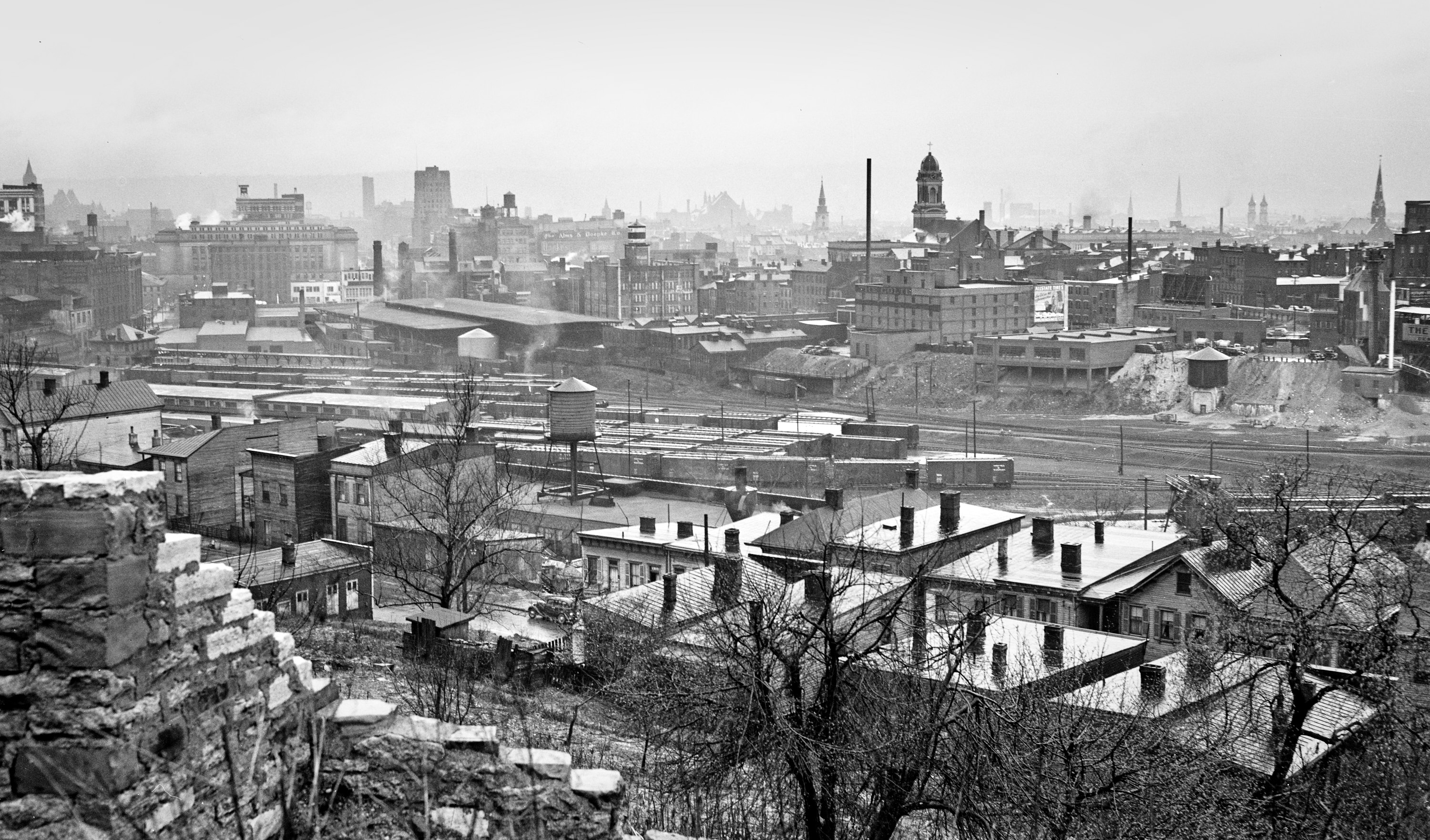 CL&N Court Street station and yard as seen from Mt. Adams. The buildings at the bottom line Gilbert Avenue, and the steep hillside up to Reading Road can be seen on the right. The small Court Street station is at the far left with the hipped roof and single track canopy extending out the back. Original photo 1939 by Nelson Ronsheim. Scanned by Michael G Smith 2009.