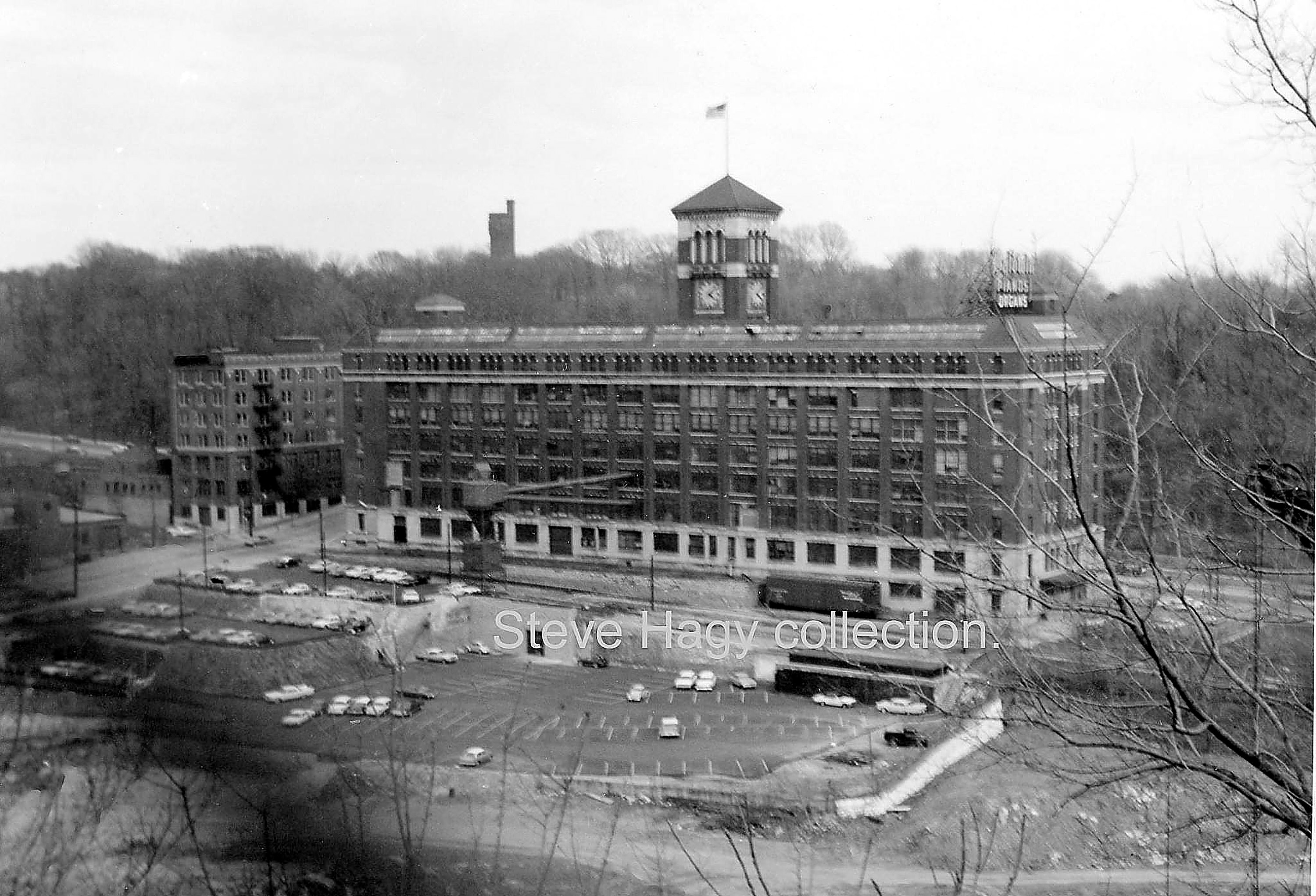 Old photo of the Baldwin Building and CL&N tracks, looking east. This is probably in the 1980s before the building was converted to offices and the parking garage constructed where the lot at the bottom is shown.