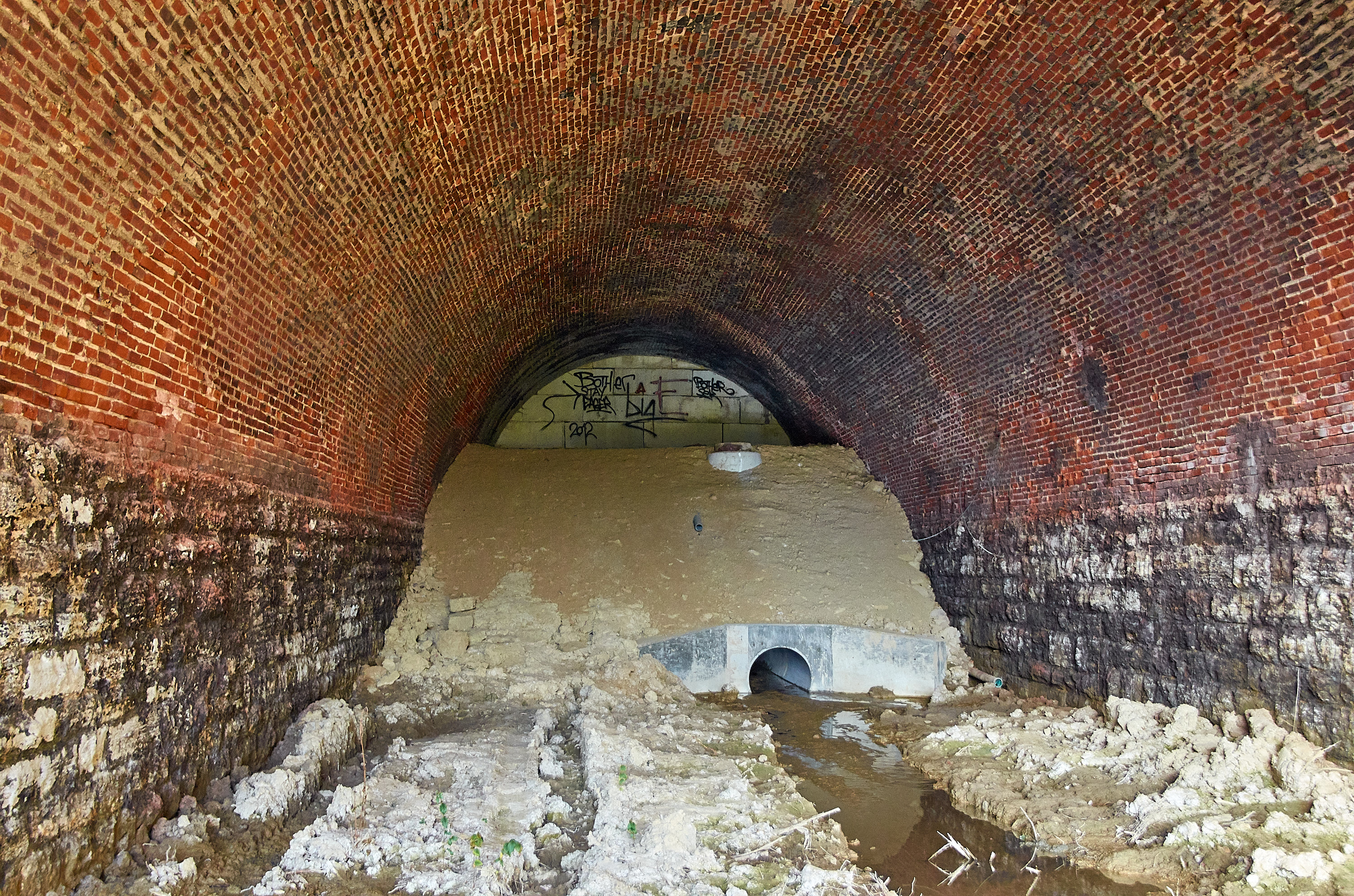 Inside the CL&N McMillan Street tunnel in Walnut Hills, looking north at the blocked off north portal.