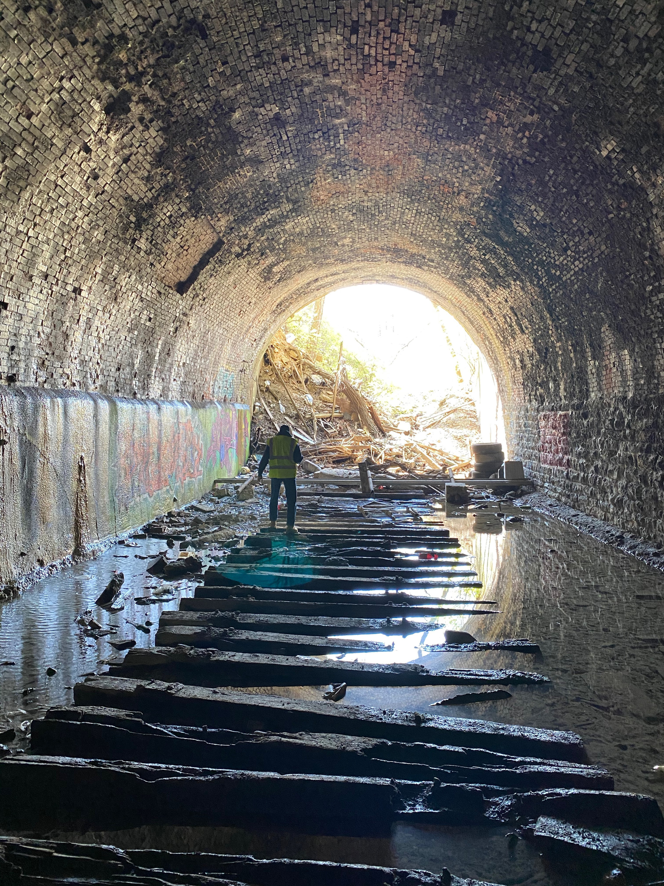 Interior view of the CL&N Oak Street Tunnel, looking south at the south portal. Note the straight stone walls at the bottom. The stone at the left was covered in concrete.