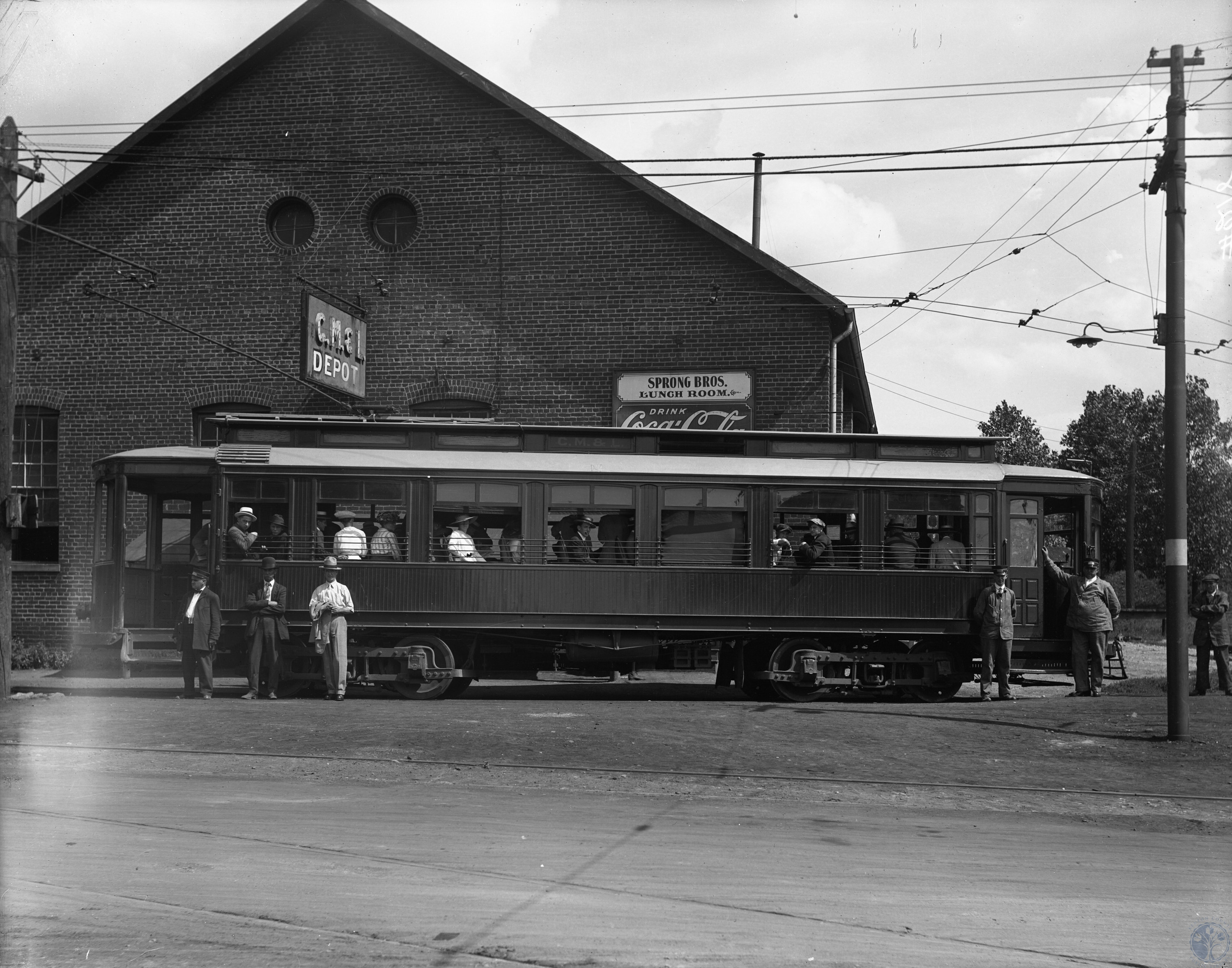 Historic photo of the CM&B depot and a car on layover next to Erie Avenue, looking east across Erie. Note the track on Erie below the interurban car. Since a heavy wooden car is shown, and the company was still called the Cincinnati, Milford, & Loveland, this photo would have to be prior to 1918. The car also looks to be in quite good shape, so this could be not long after operations began.