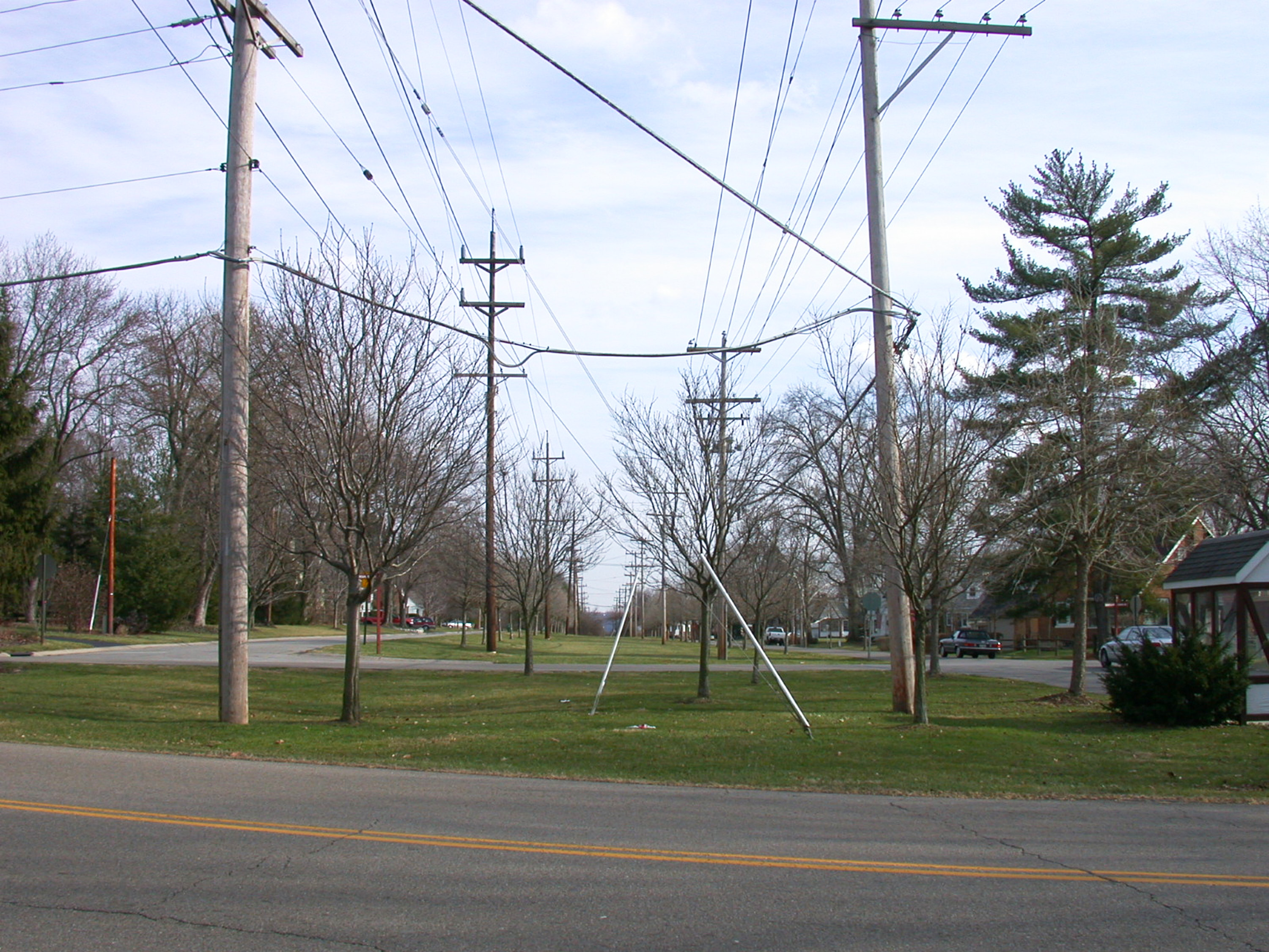 CM&B/Milford Line right-of-way, looking east from Miami Road along Murray Avenue in Mariemont, note how the power lines mark the route.