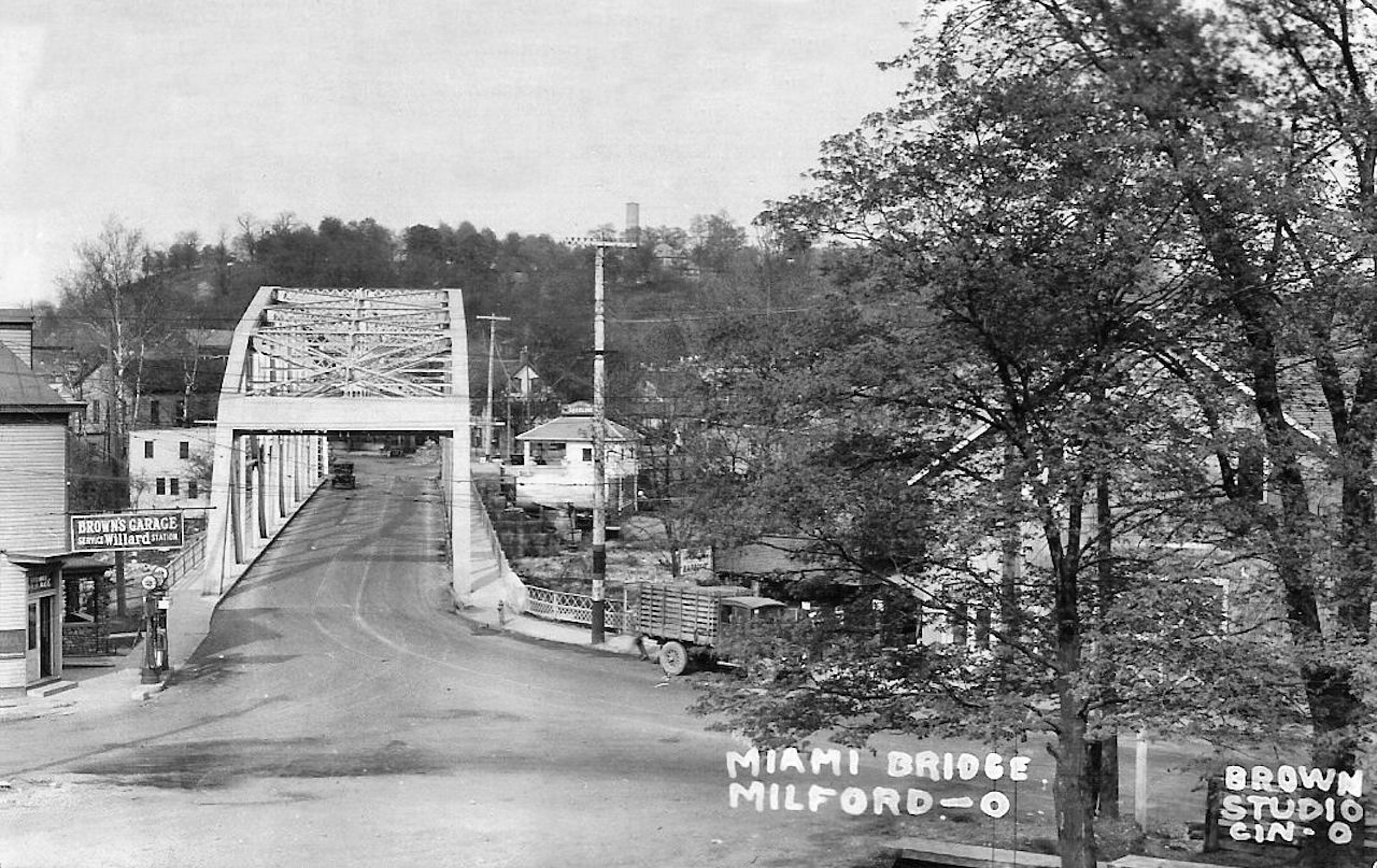 Historic photo showing the CM&B on the Little Miami River bridge in Milford, looking east from the PRR/Little Miami Railroad station. This bridge was built in the 1920s. Note that now the track runs down the middle.