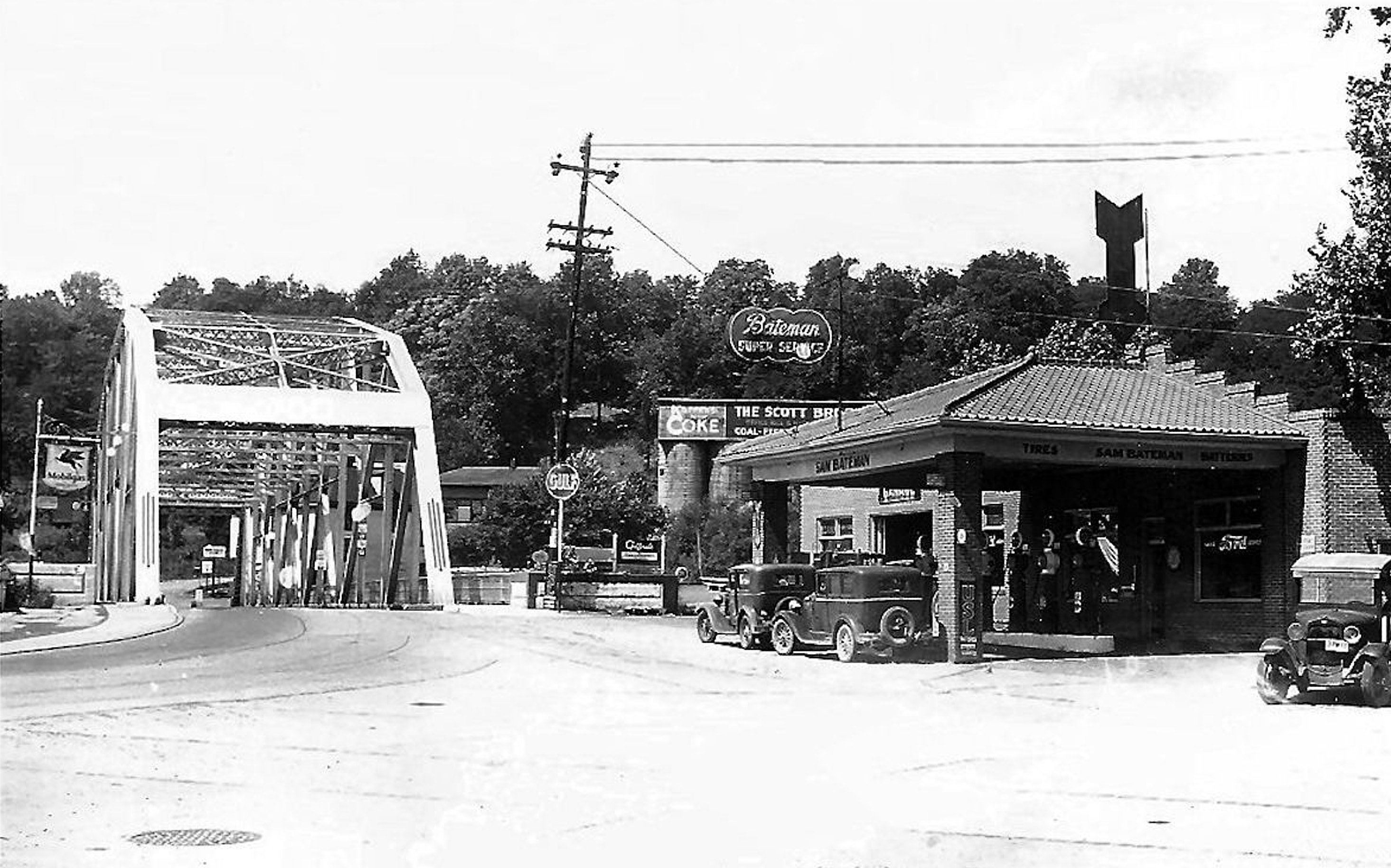Historic photo showing the CM&B on the Little Miami River bridge in Milford, looking west towards the PRR/Little Maimi Railroad station. Note the track in the street.