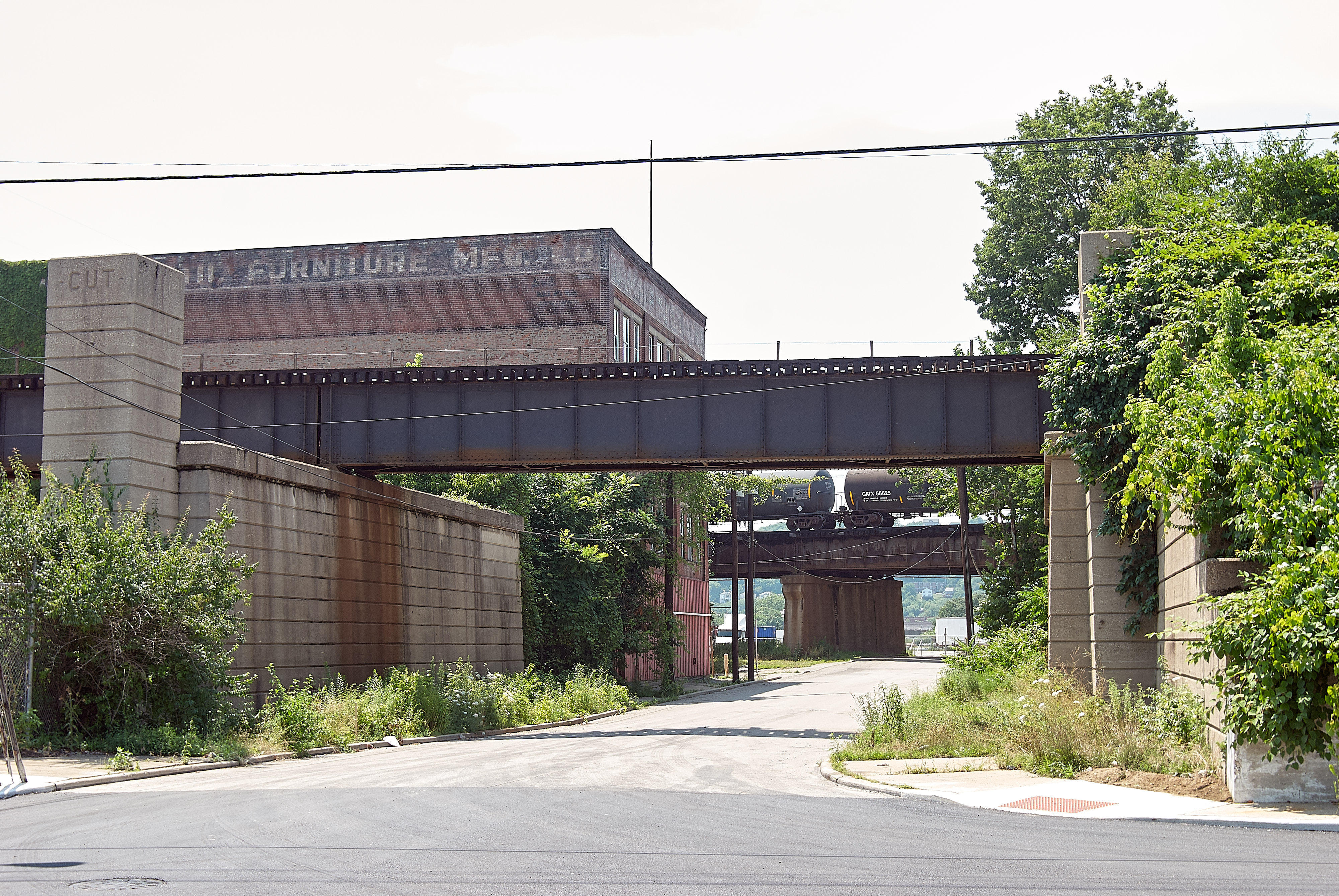 Southern approach to Union Terminal, looking west from the intersection of Budd Street and McLean Avenue. The extra bridge space here was for connections with the B&O and Big Four lines coming from Indiana along the Ohio River. More piers from that viaduct can be seen from the 6th Street Expressway and Mehring Way. Note "CUT" on the left, for Cincinnati Union Terminal. The bridge in the background with the tanker cars is the older approach to the Cincinnati Southern's bridge over the Ohio River.