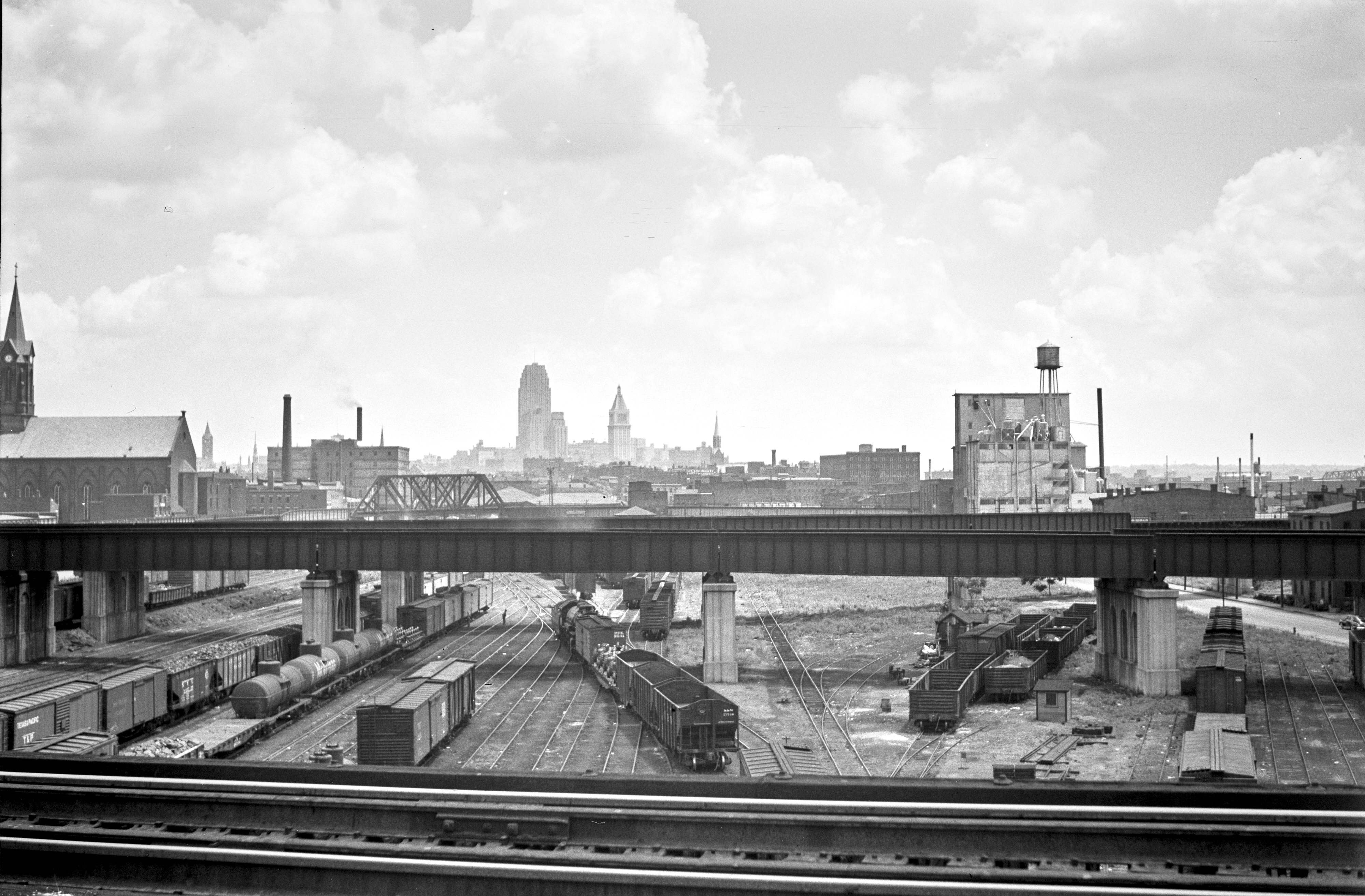 Historic photo of Queensgate and the various railroad yards and viaducts, looking east from the north approach to the Cincinnati Southern Bridge. 6th Street is barely visible at the right, and the current 6th Street Expressway runs along the right side of this photo now. The viaduct from the previous photo is running across the center, whose piers are all that remain today. The C&O viaduct can be seen directly behind it curving to the east. The small truss bridge in the distance is part of the viaduct that used to connect the Waterfront Belt Line with the Mill Creek Valley railroads. Original photo 6-15-1941 by Nelson Ronsheim. Scanned by Michael G. Smith.