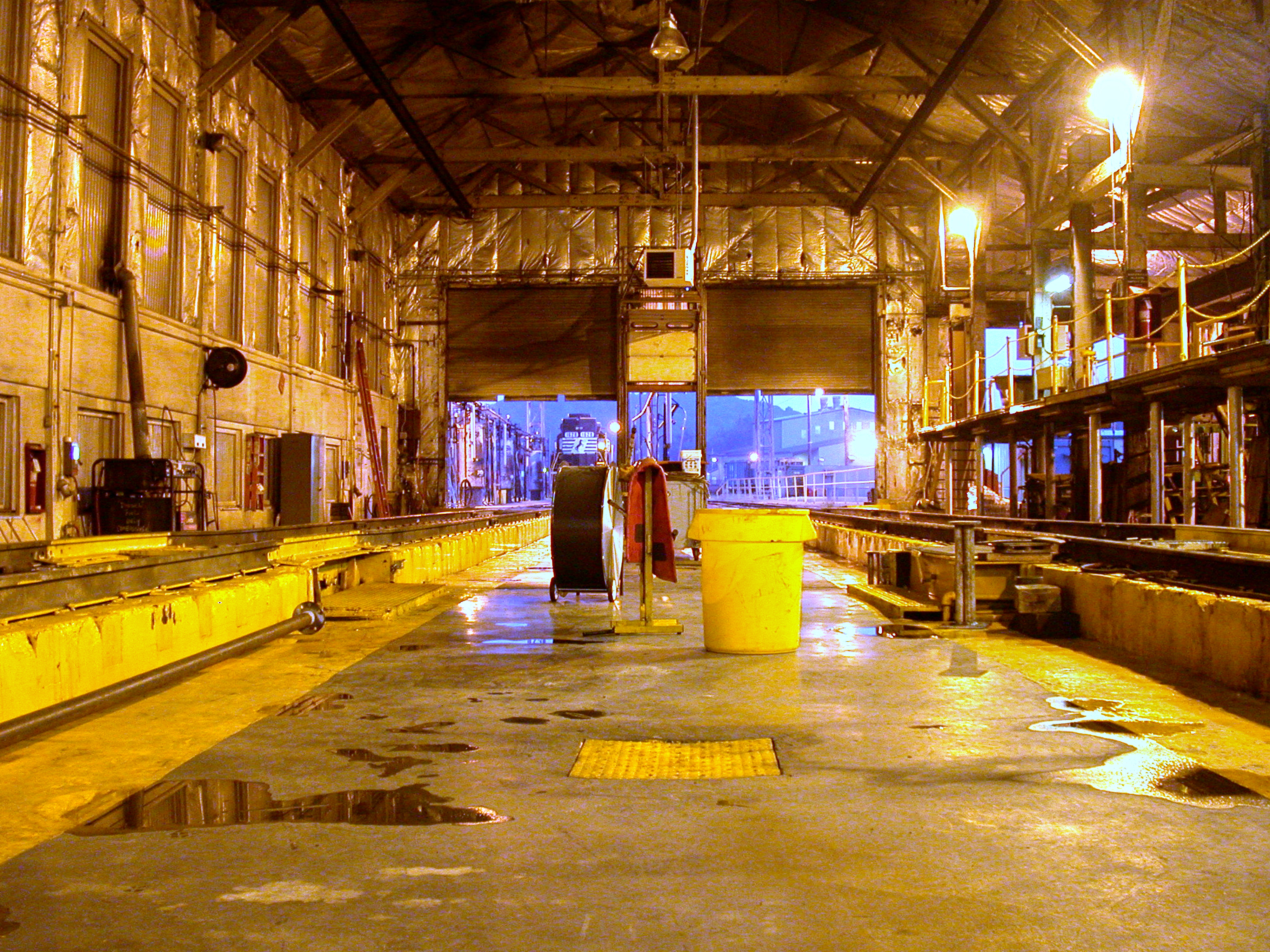 Inside the Cincinnati Southern's repair shops in Ludlow Kentucky. Note the Norfolk Southern locomotive just outside waiting to be worked on.