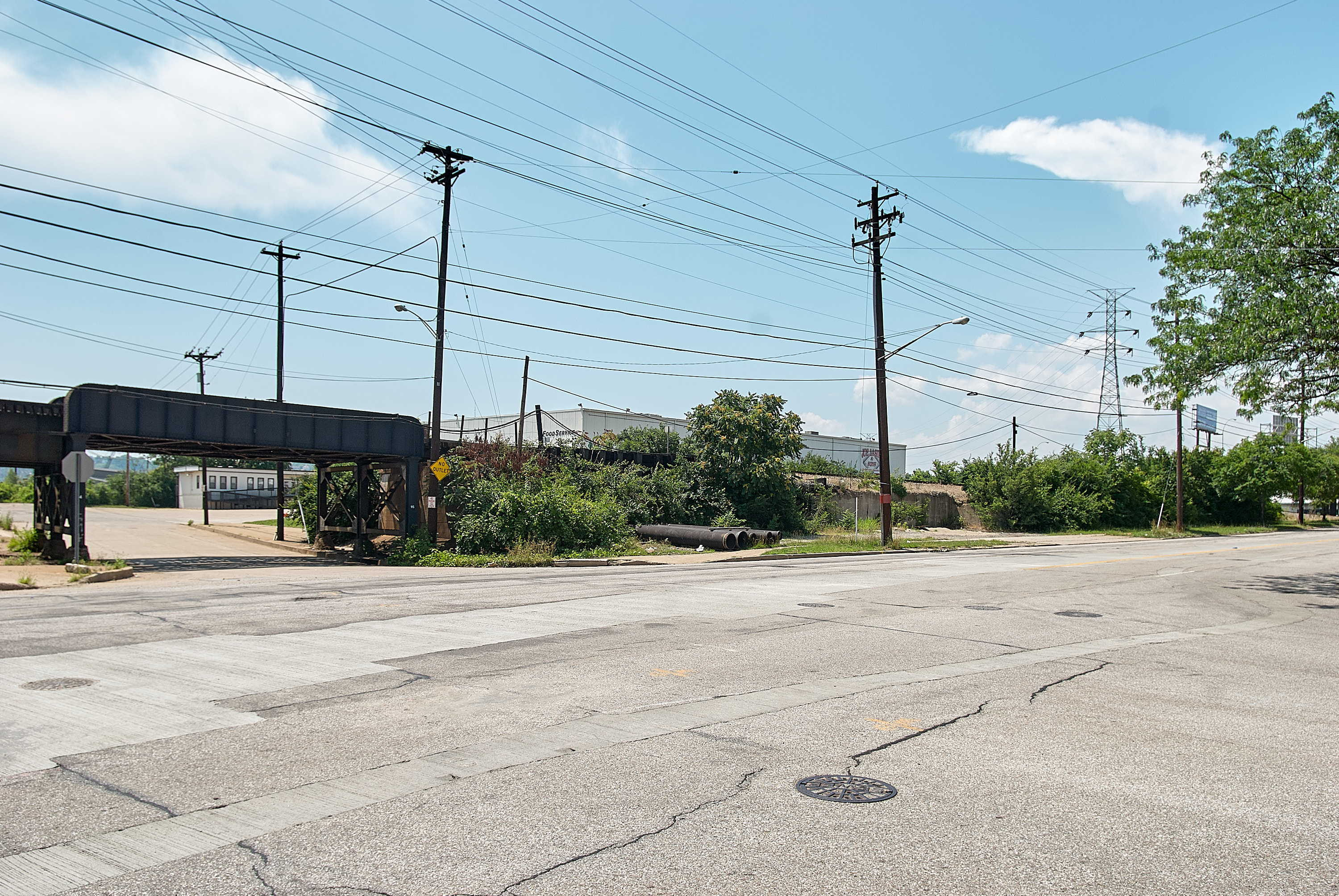 A more recent view of Fifth and Linn Streets, former location of the CH&D station, looking northwest. Note that Baymiller has been renamed Linn Street here, and it was significantly widened, removing much of the land the station once occupied. The remaining tracks and overpass is for the C&O viaduct.