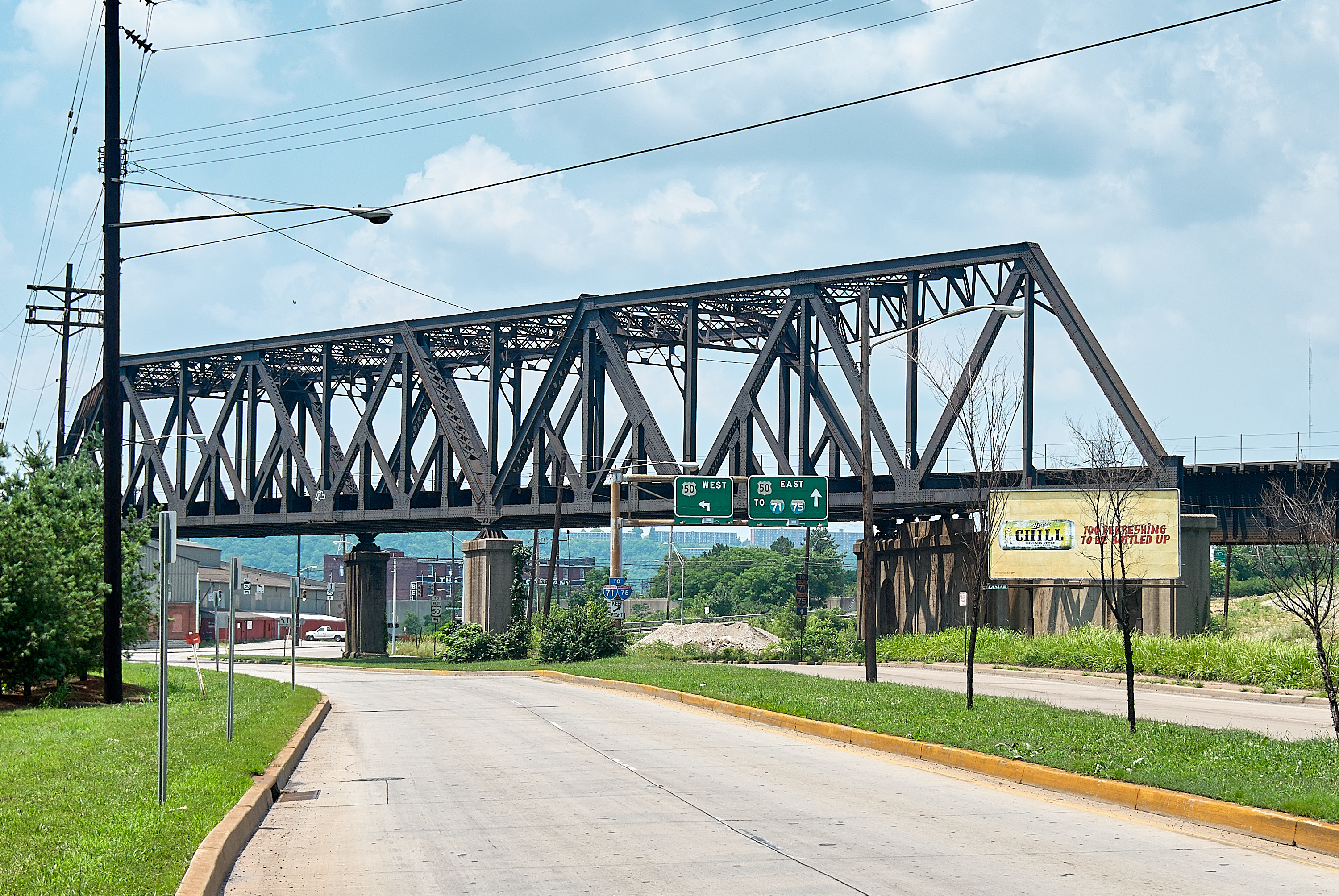 Current view of Mehring Way, looking northwest towards 5th Street and Freeman Avenue in Queensgate. The rail at ground level to the left of the street is out of the picture and overgrown. The billboard on the right remains, as does the utility pole on the left with the three cross-arms.