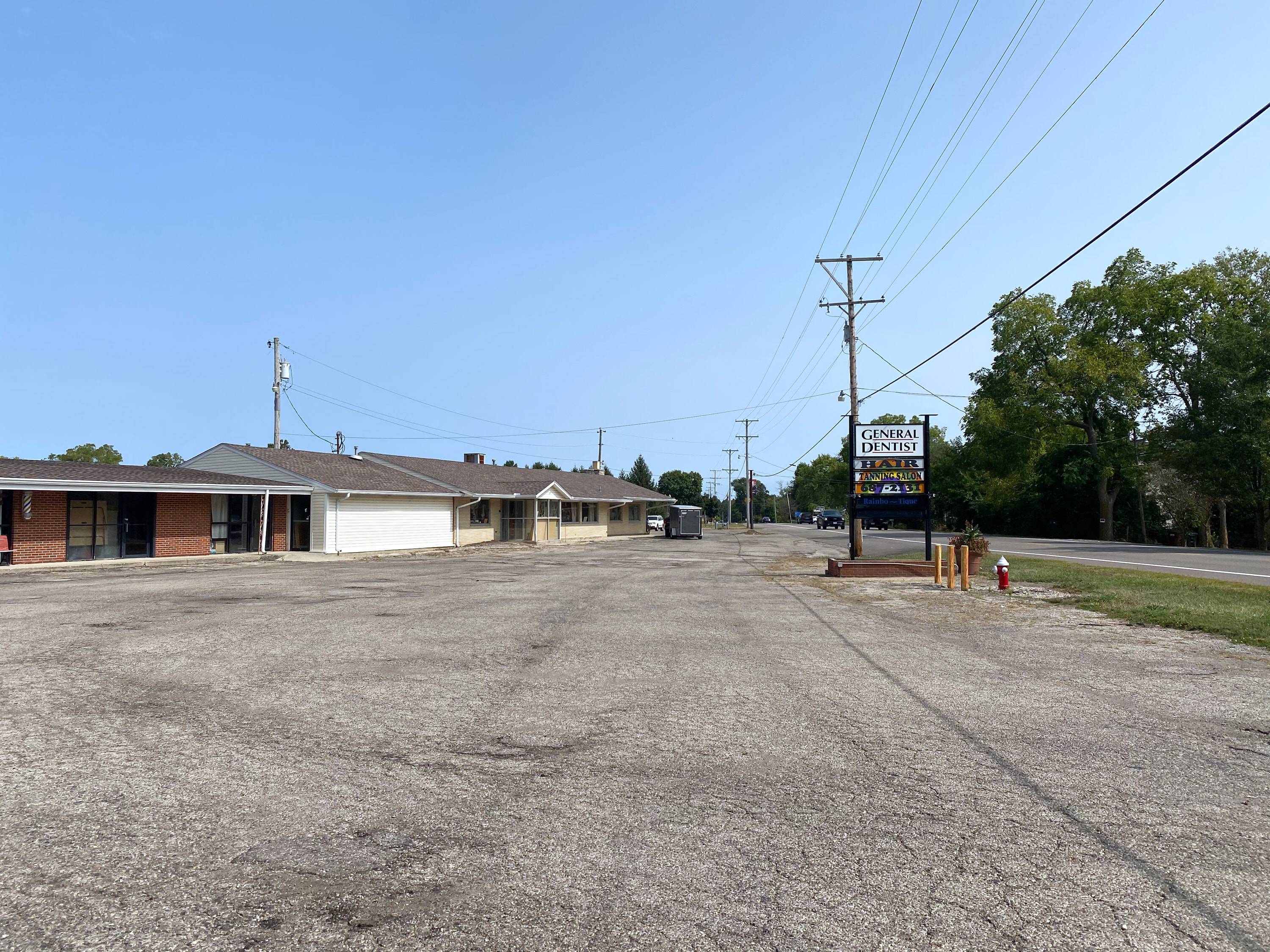 Start of the Dayton & Western Valley Bluff bypass just west of Access Road in New Lebanon, looking east. This building sits directly on top of the former private right-of-way for the Valley Bluff bypass of New Lebanon, hence the skewed angle.