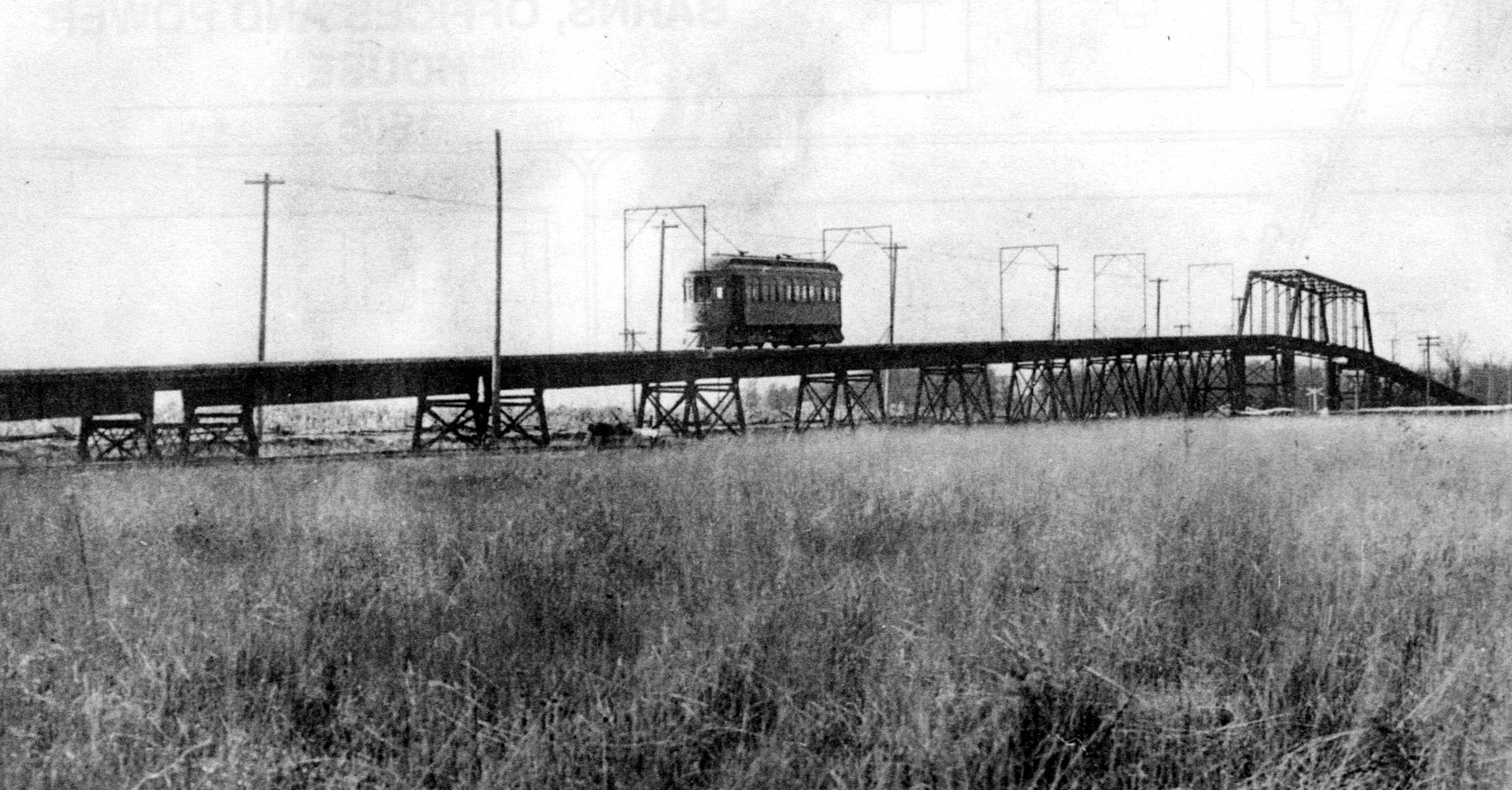 Historic photo of a Dayton & Western car climbing the Ohio Viaduct, looking northwest with US-35 behind the viaduct approach.