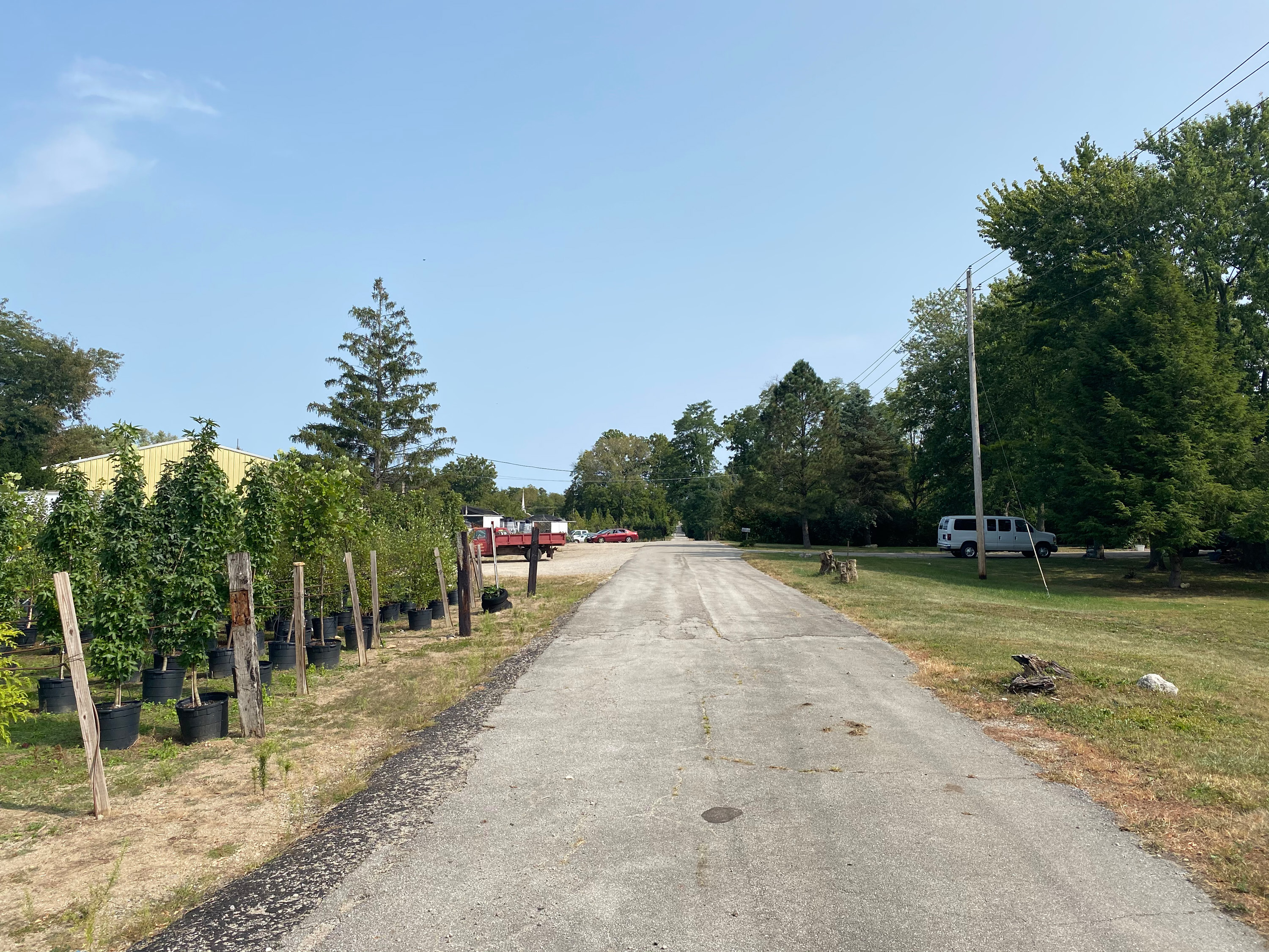 Dayton & Western route along Roby Lane just east of the former Pennsylvania Railroad's Richmond Division tracks, now Norfolk Southern, between Richmond Indiana and the Ohio/Indiana state line, looking east. The east approach to the Indiana Viaduct was to the left where the potted trees are.